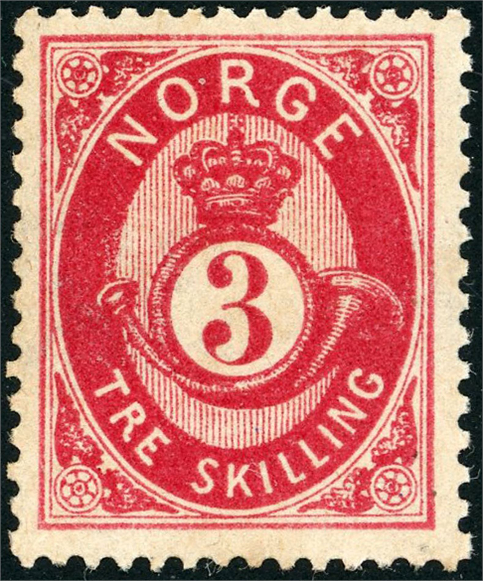 18 bX. 3 skilling Posthorn. Meget friskt merke med god tagging. (4.000,-).