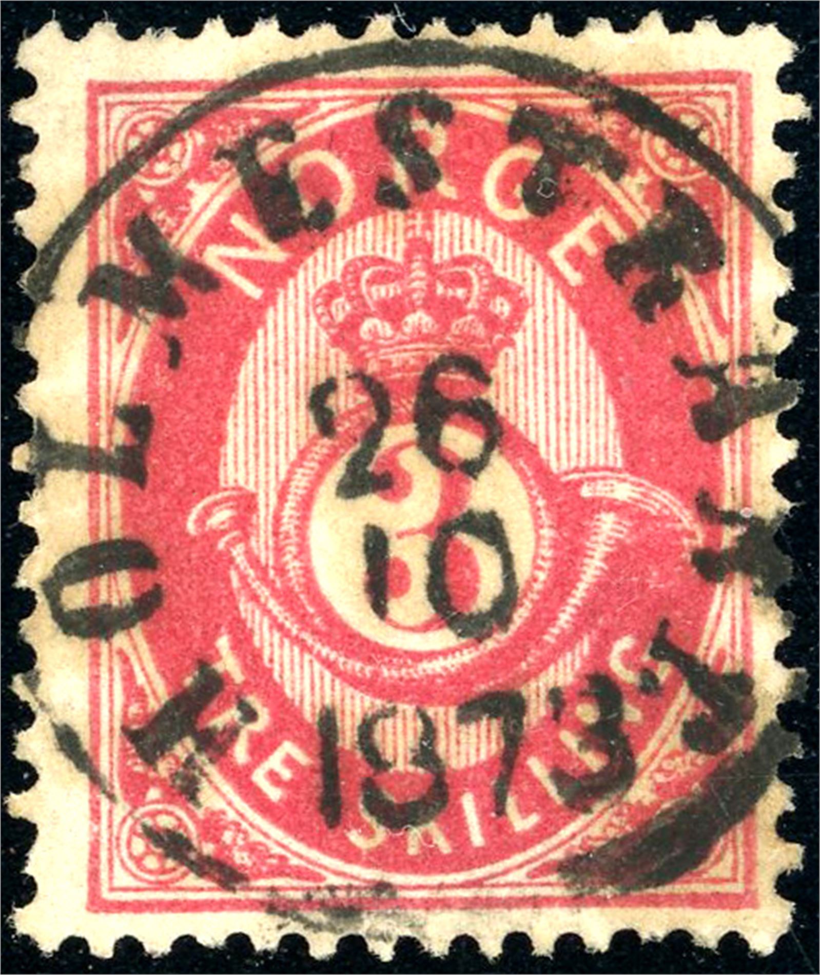 18. 3 skilling Posthorn, rettvendt fullstemplet "Holmestrand 26.10.1873".