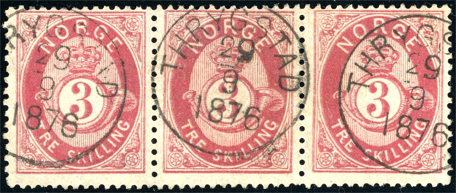 18 c. 3 skilling Posthorn i horisontal 3-stripe, pent stemplet "Thrygstad 29.9.1876".