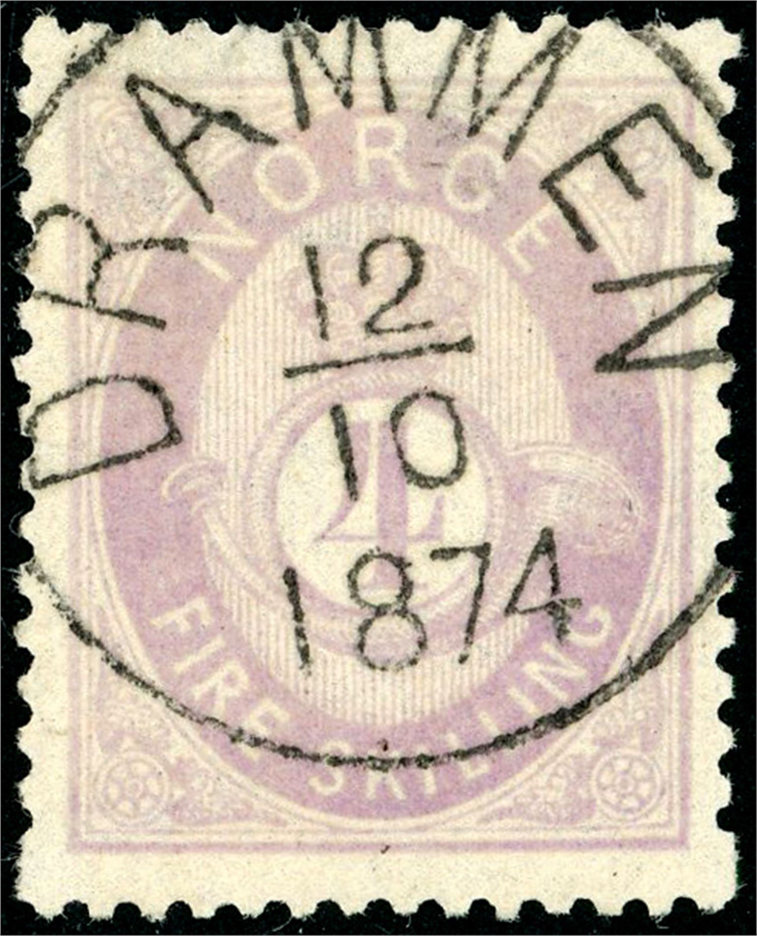 19 II. 4 skilling Posthorn, pent fullstemplet "Drammen 12.10.1874".
