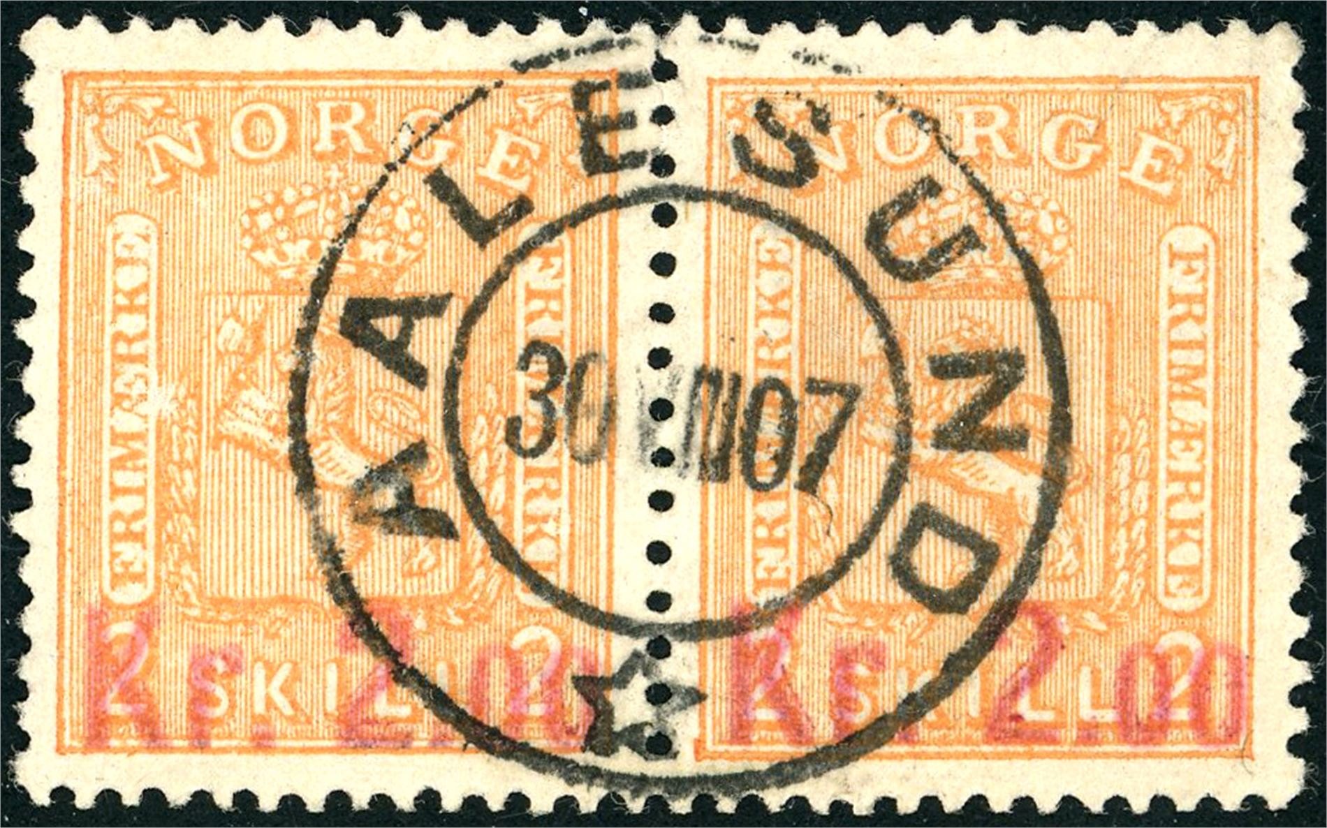 87 II. 2 kr Provisorie 1905 i horisontalt par, vakkert stemplet "Aalesund 30.8.07".