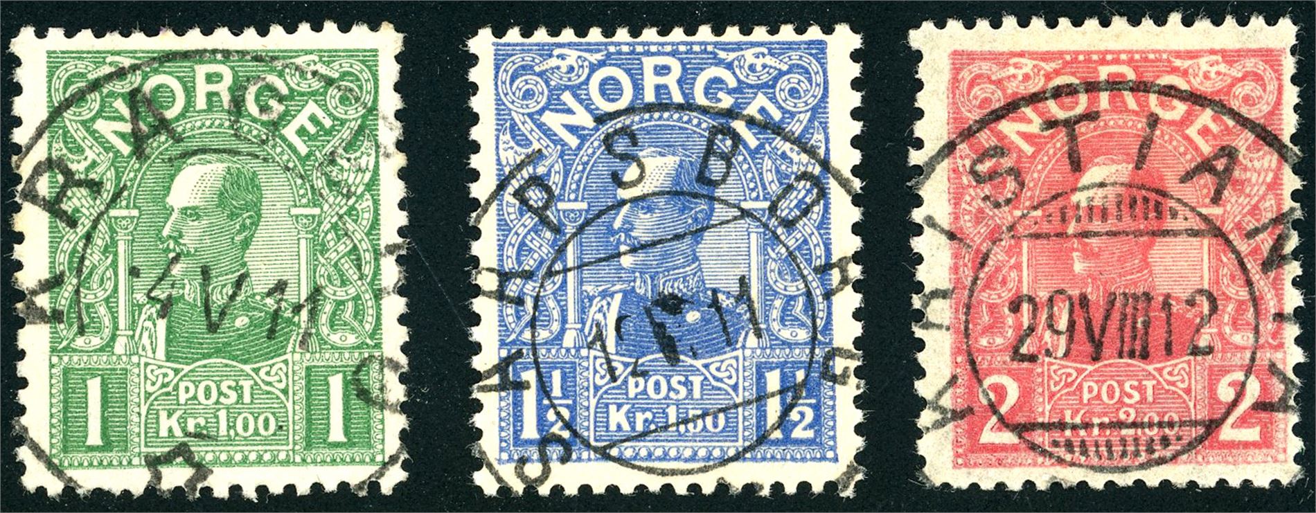 93/95. Haakon 1909 i komplett serie, alle merkene er pent stemplet.