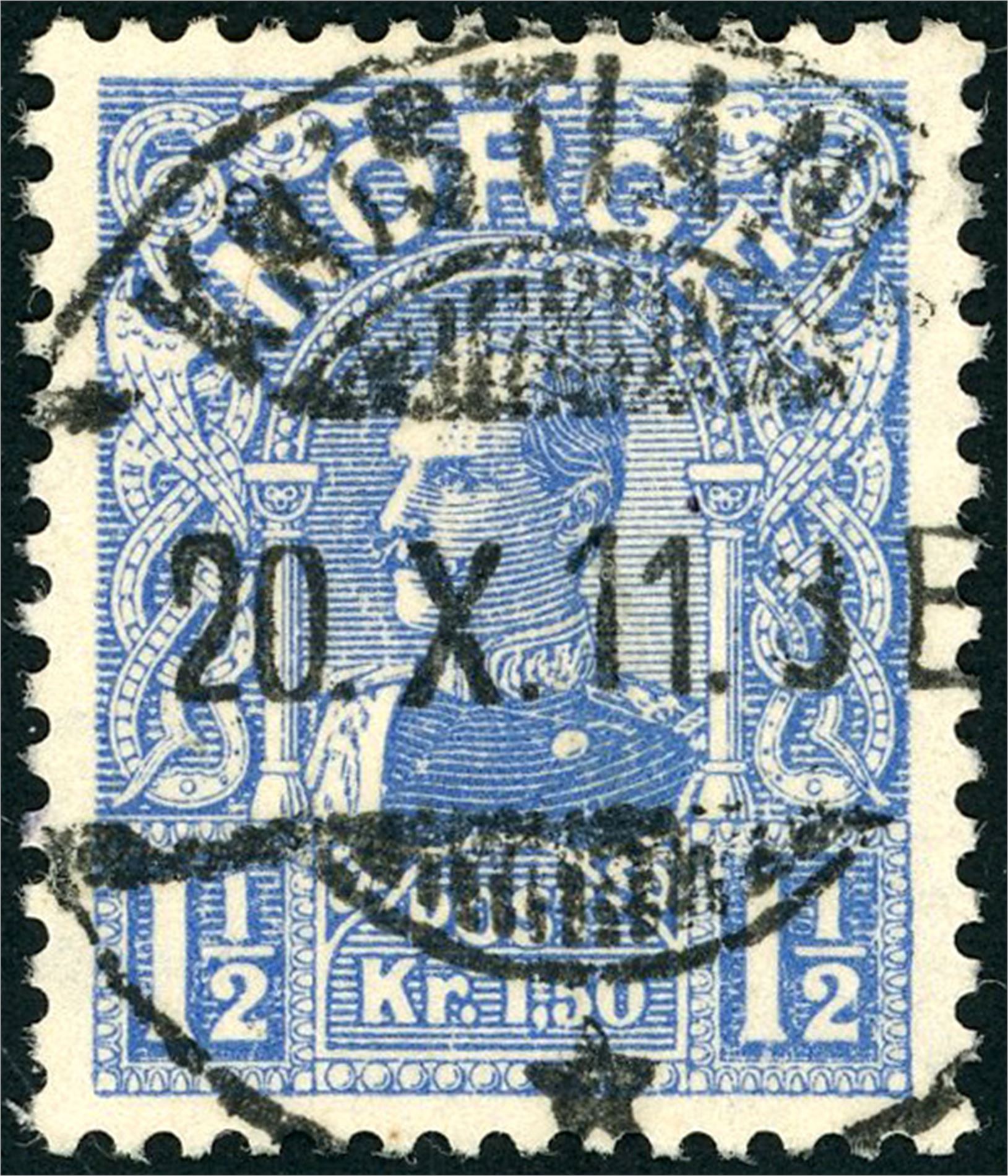 94. 1 1/2 kr Haakon 1909, rettvendt stemplet "Kristiania 20.10.11".