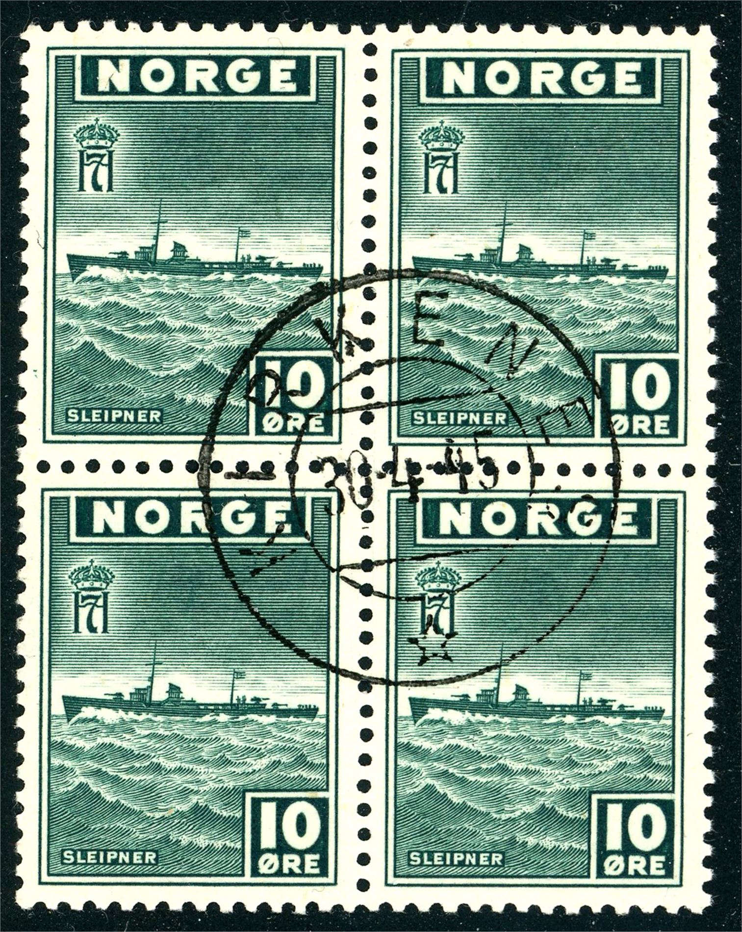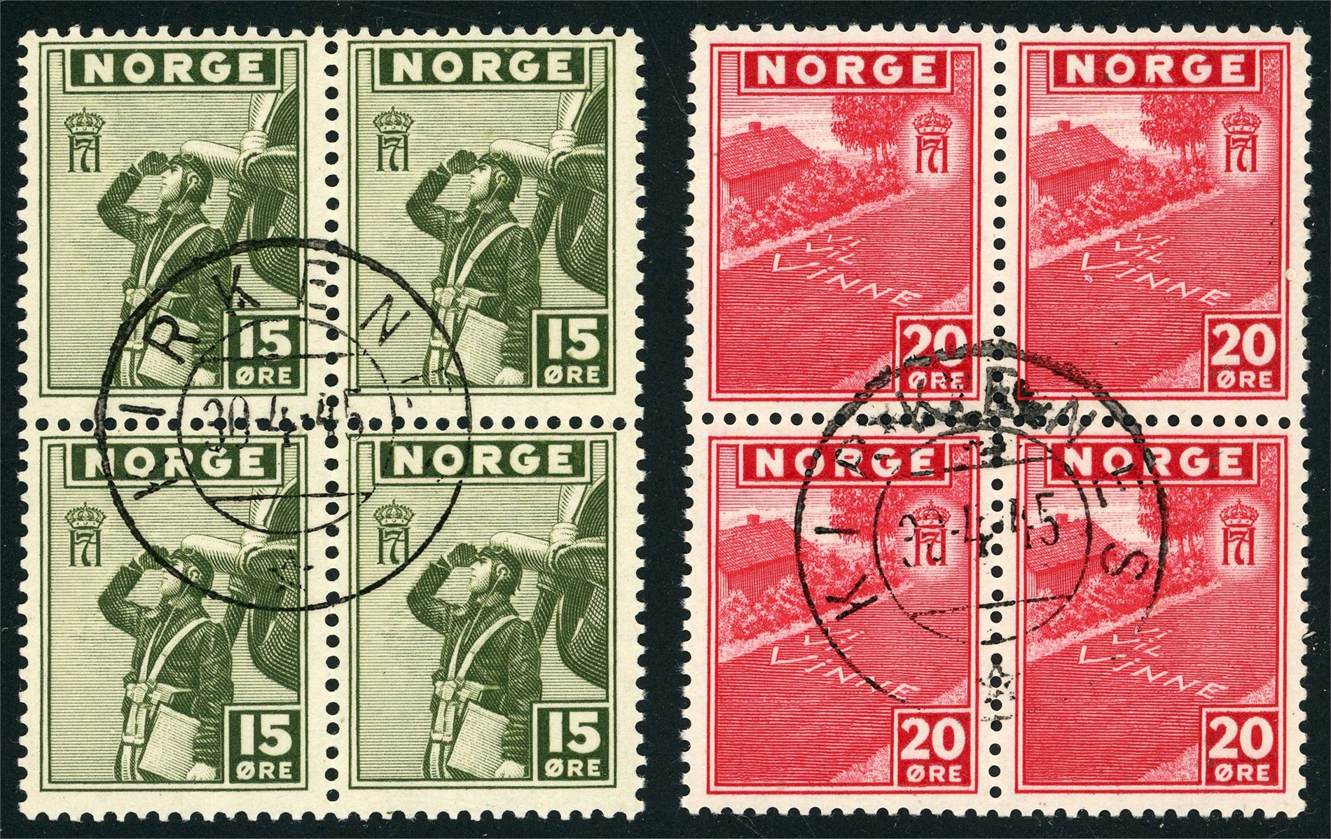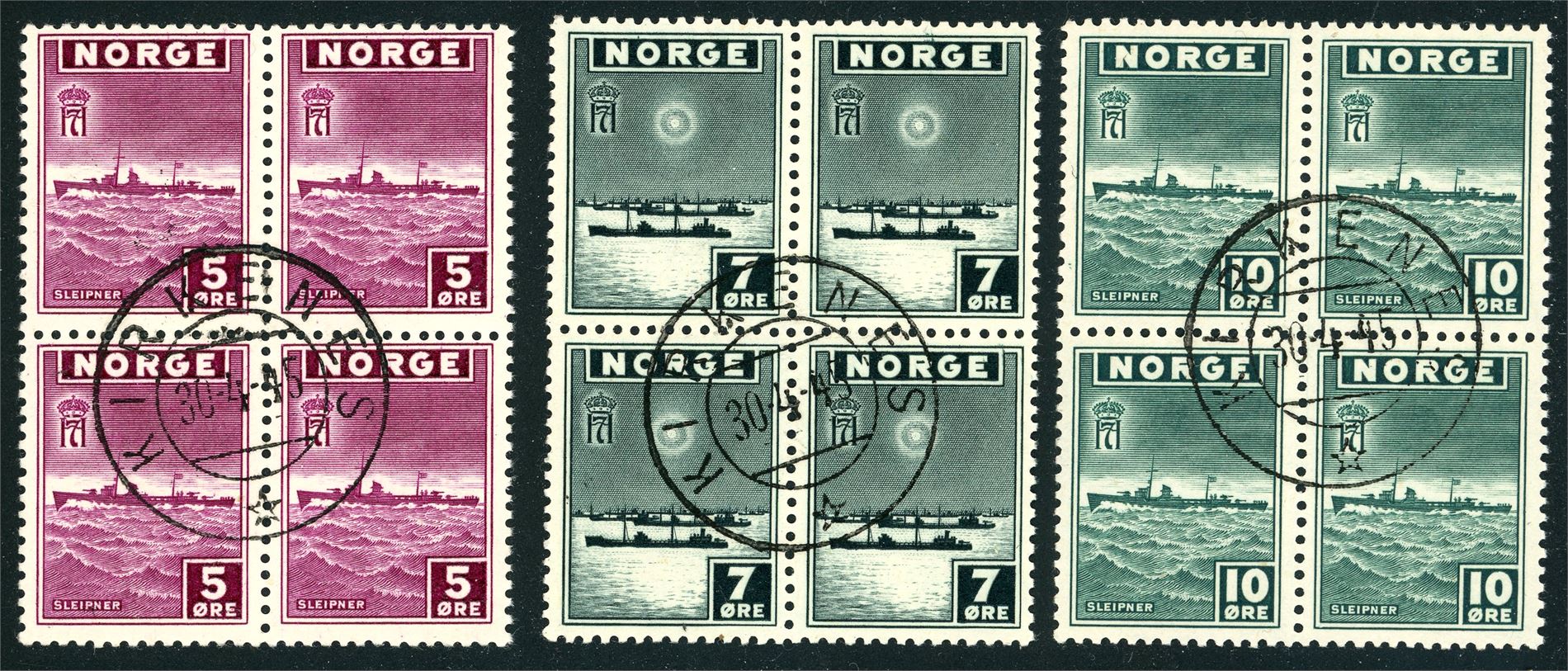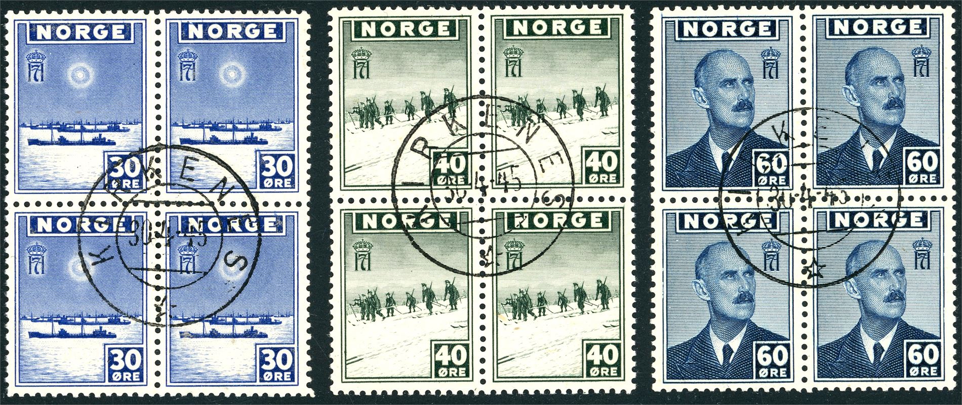 333/38. Londonmerkene, komplett i 4-blokker, alle stemplet "Kirkenes 30.4.40". Ex Postmesteren i Kirkenes.