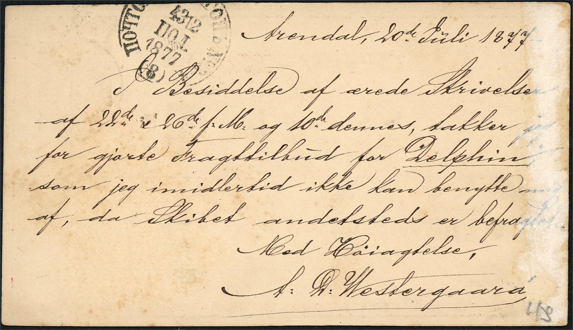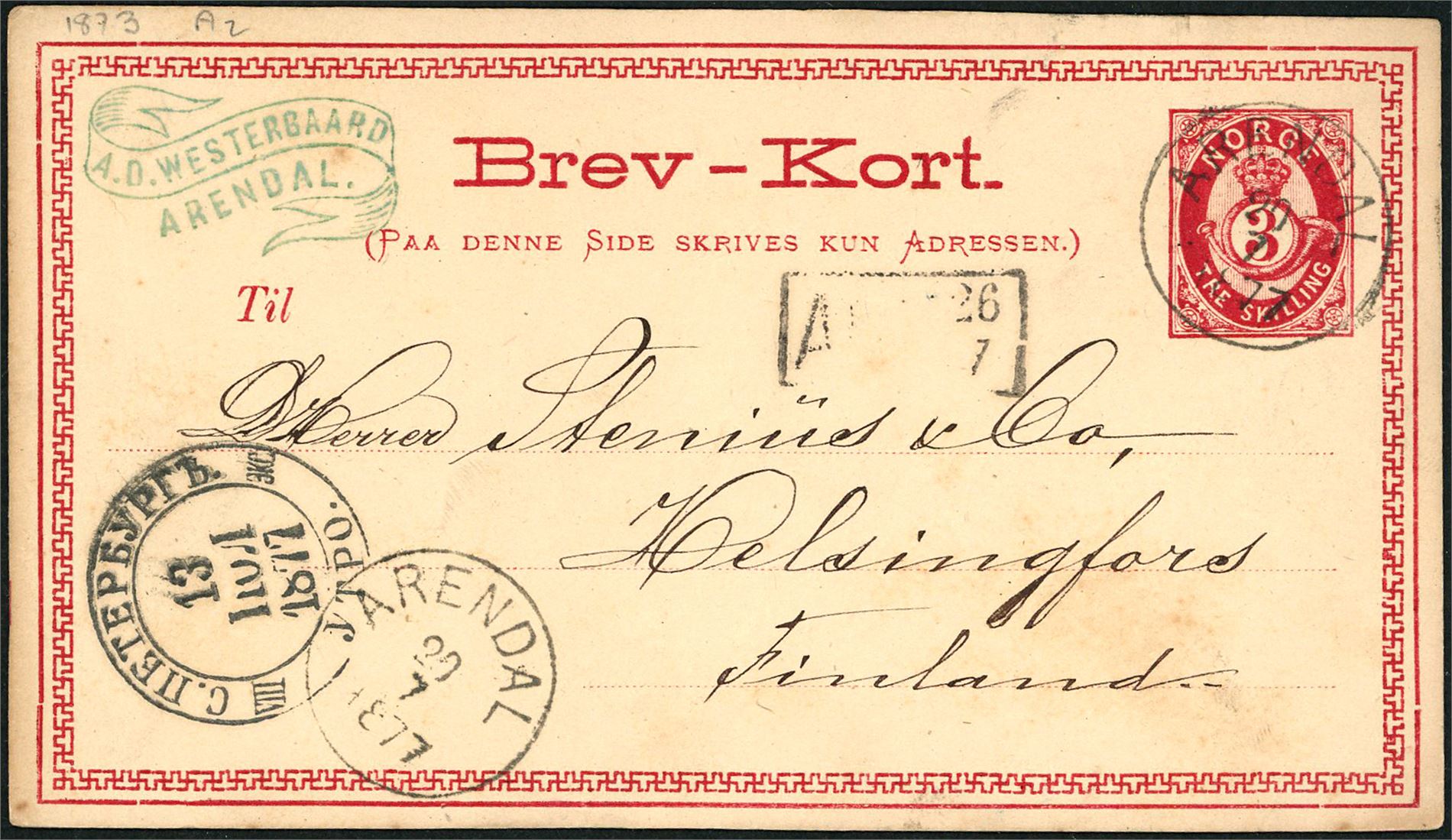 3 skilling Brev-kort, stemplet "Arendal 20.7.1877" og sendt til finland. Ankomststemplet.