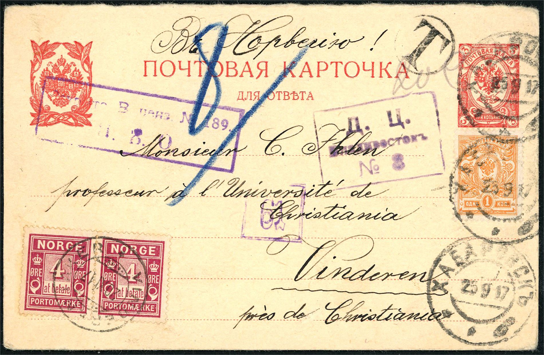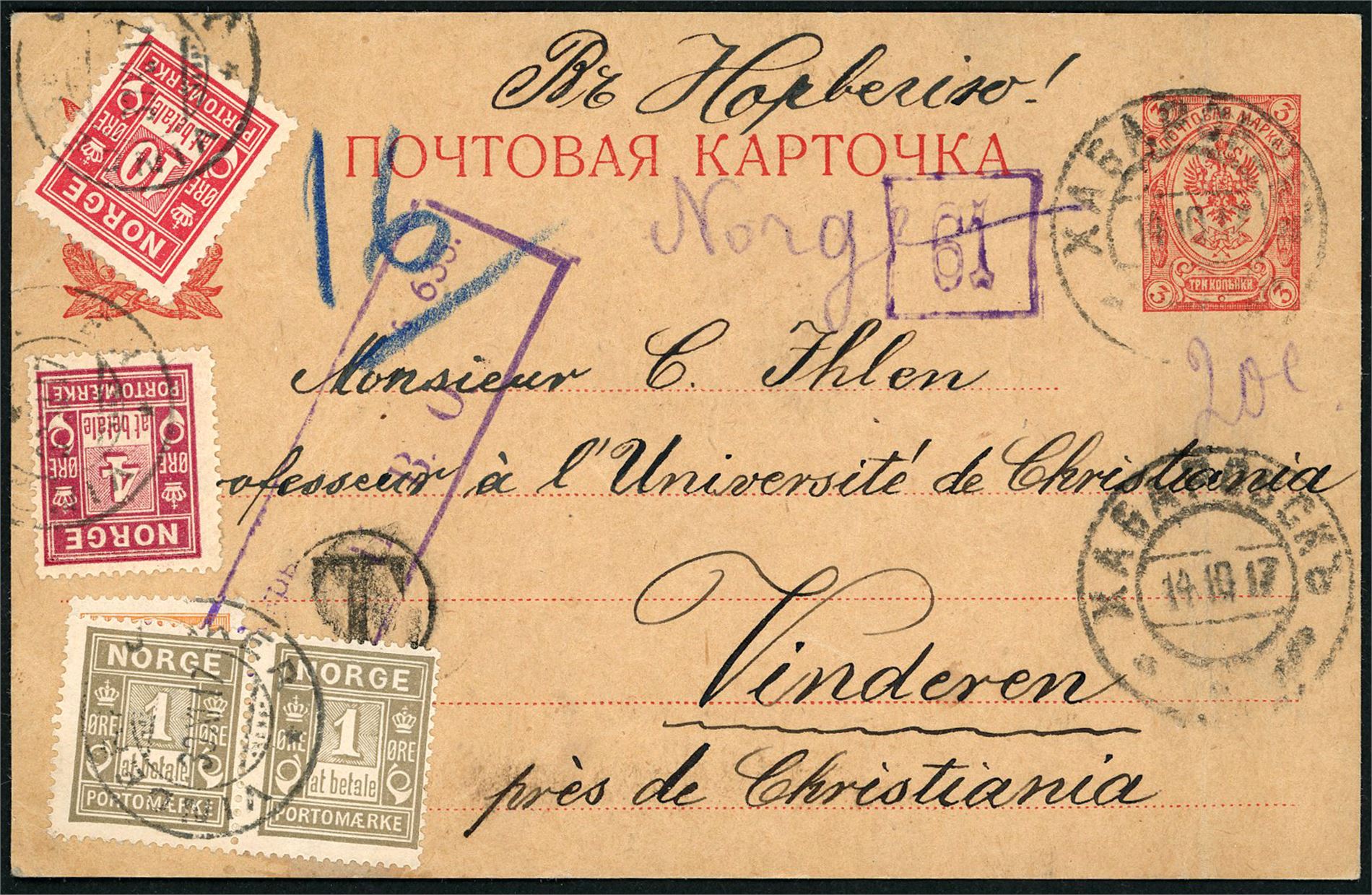 Two Russian stationarie-cards, sent from Khabarovsk in 1917, both censored in Vladivostok, and sent to Norway. Both with Norwegian Postage Due stamps.