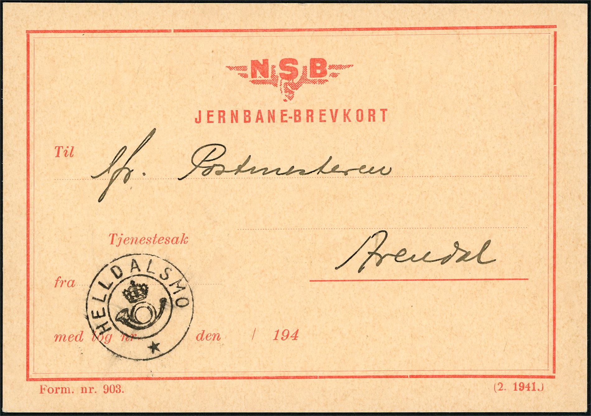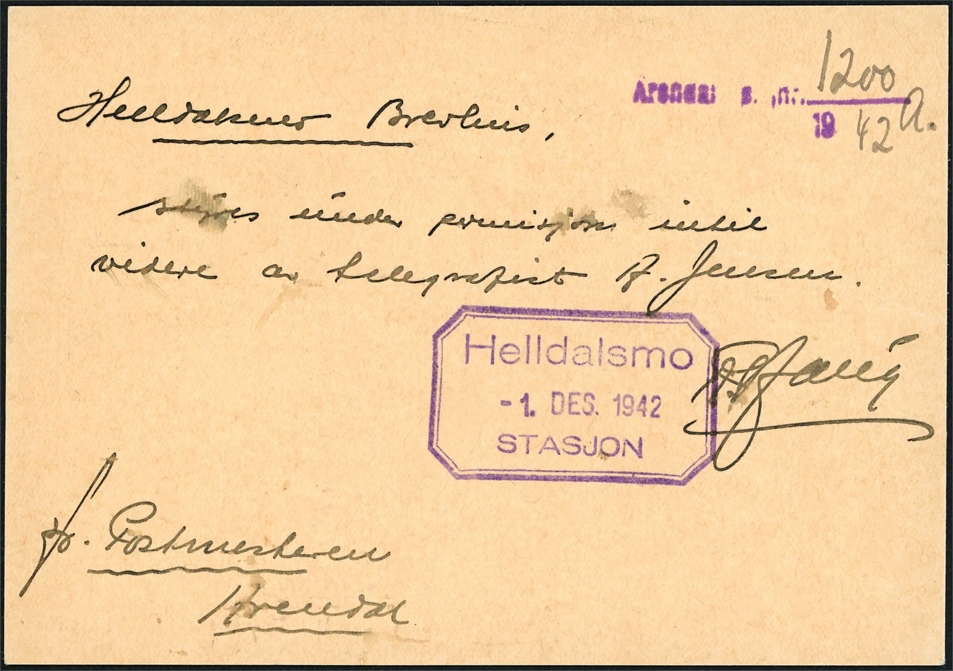 Ufrankert "NSB jernbane-Brevkort", med KPH "Helldalsmo" (AA, 7 pkt) og sendt til Arendal 1. desember 1942.