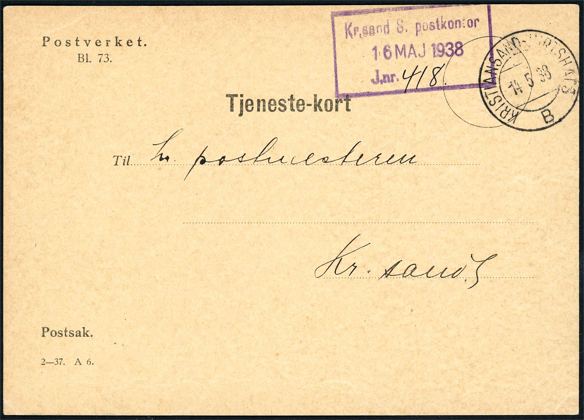 Kristiansand-Hirtshals. En frankert konvolutt, med litra "A" og et ufrankert "Tjeneste-kort" (Bl. 73), med litra "B".