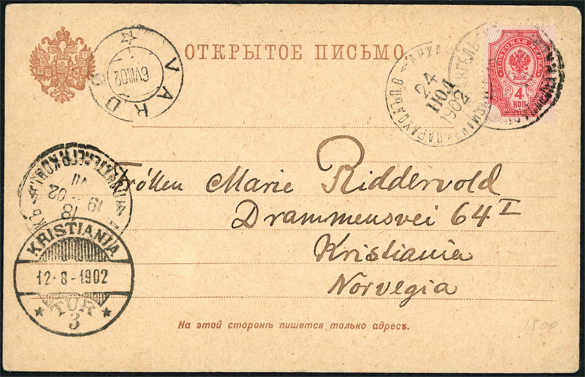 40. Russia. 4 Kop on lettercard from Arkhangel 18. July, cancelled with postmark from the steamship "SS Imperator Nicolai II" "24 Jul 1902" and sent to Kristiania. Transittpostmark "Vardø 6.8.02" and arrival cds "Kristiania 12.8.1902 Tur 3" at side.