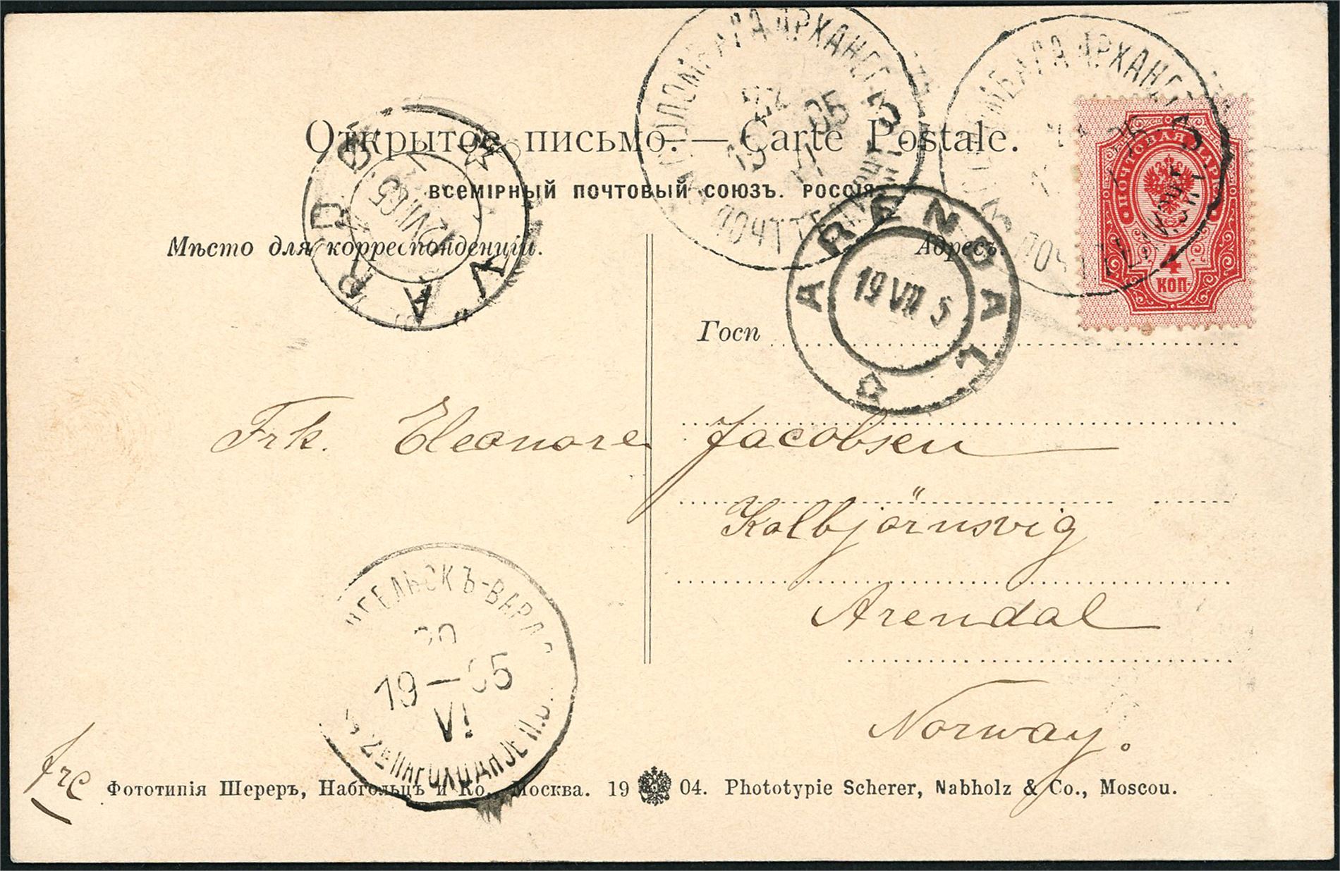 40. Russia. 4 Kop on postcard, cancelled "Solombala 22.6.1905" and sent to Arendal, Norway. The card has been sent by "SS Imperator Nikolai I" from Arkhangelsk and cancelled "Arkhangelsk-Vardø 2. Steamship 30.6.". "Vardø 12.7.05" cds and arrival postmark "Arendal 19.7.05" at side.