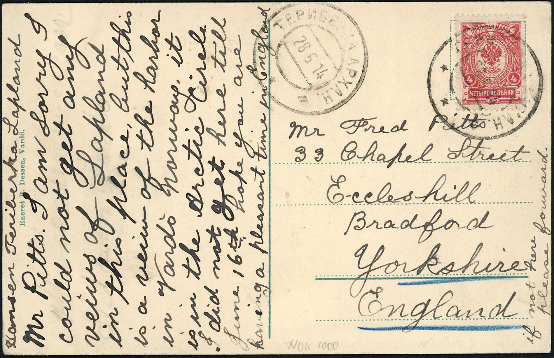 66. Russia. 4 kop on postcard, cancelled "Teriberka 28.5.14" and sendt to England, probably sent with "SS Lomonosov" which arrived Vardø 10 June, and then with "SS Sirius" which left Vardø 12. June on the Hamburger route.
