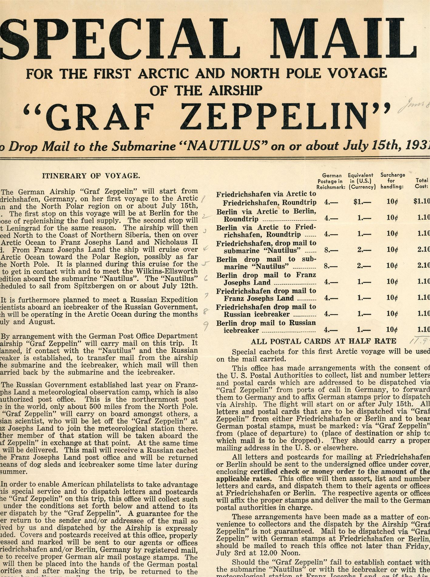 Graf Zeppelin, postal leaflets, LZ, Artic flight. 15cm*26cm issued by DZ concerning postal arrangments for the flight + drop mail to the submarine Nautilus, folded in thirds, ephemera from the flight is rarely seen. Very fine.