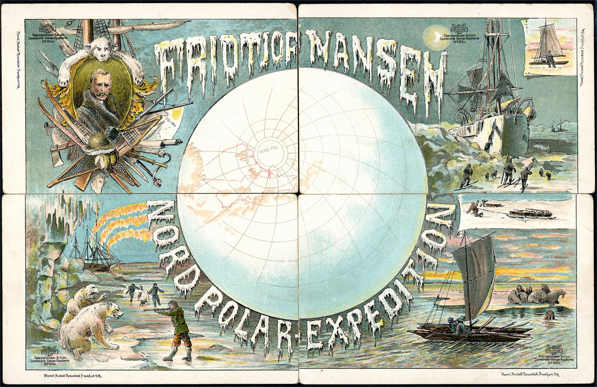 Fridjof Nansen Nord Polar Expedition. De 4 dekorative kortene som kan settes sammen til et stort motiv. Kunst Anstalt Rosenblatt Frankfurt a/M. Alle kortene med en hjørnebrett. K-3 (5246601)