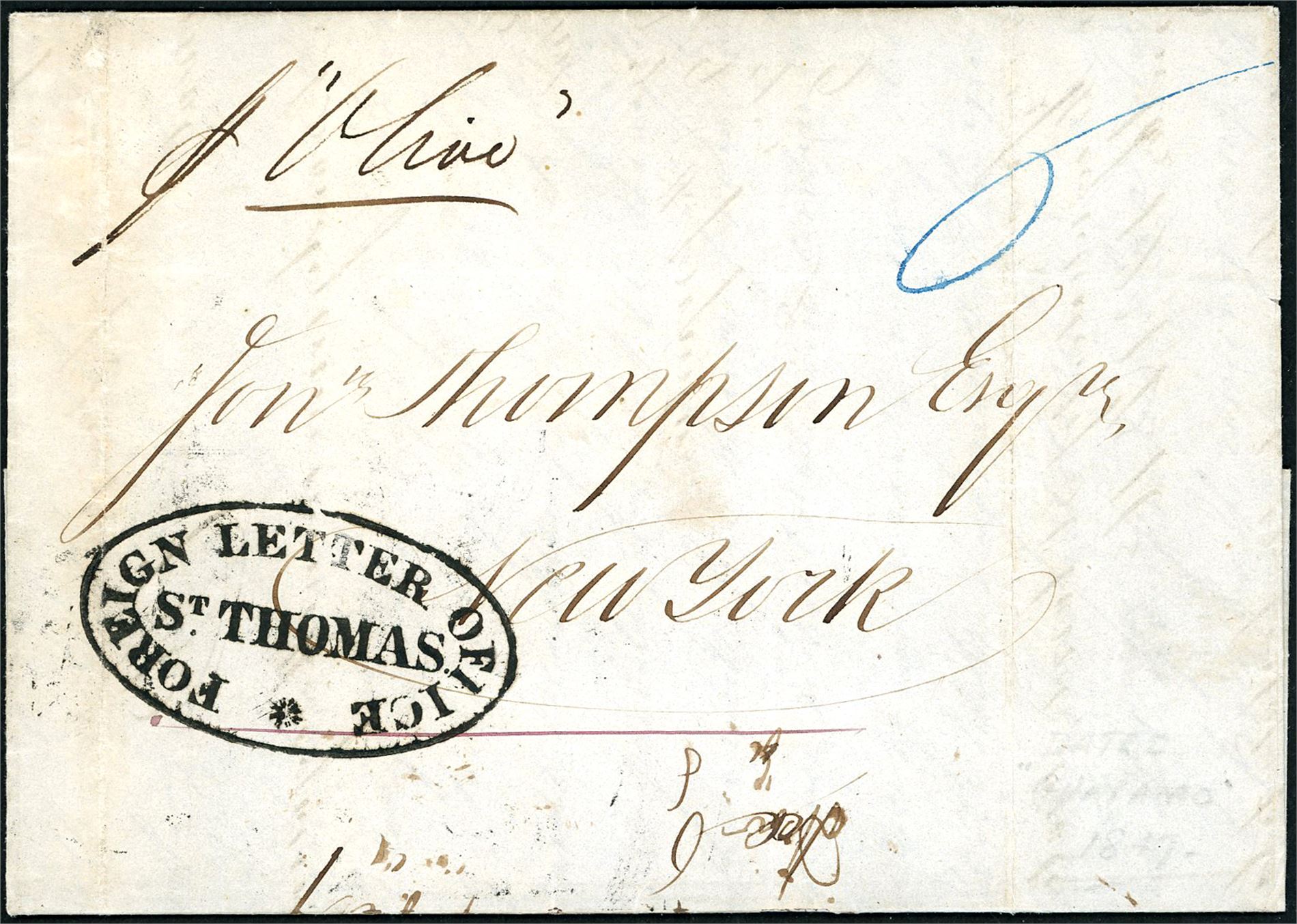A complete letter dated "Guayama November 14 1847" (Puerto Rico) and sent to New York. Written "pr Ohio" on front together with a blue "6" postage number and the unusual oval "Foreign Letter Office St. Thomas" stamp. (5251597)