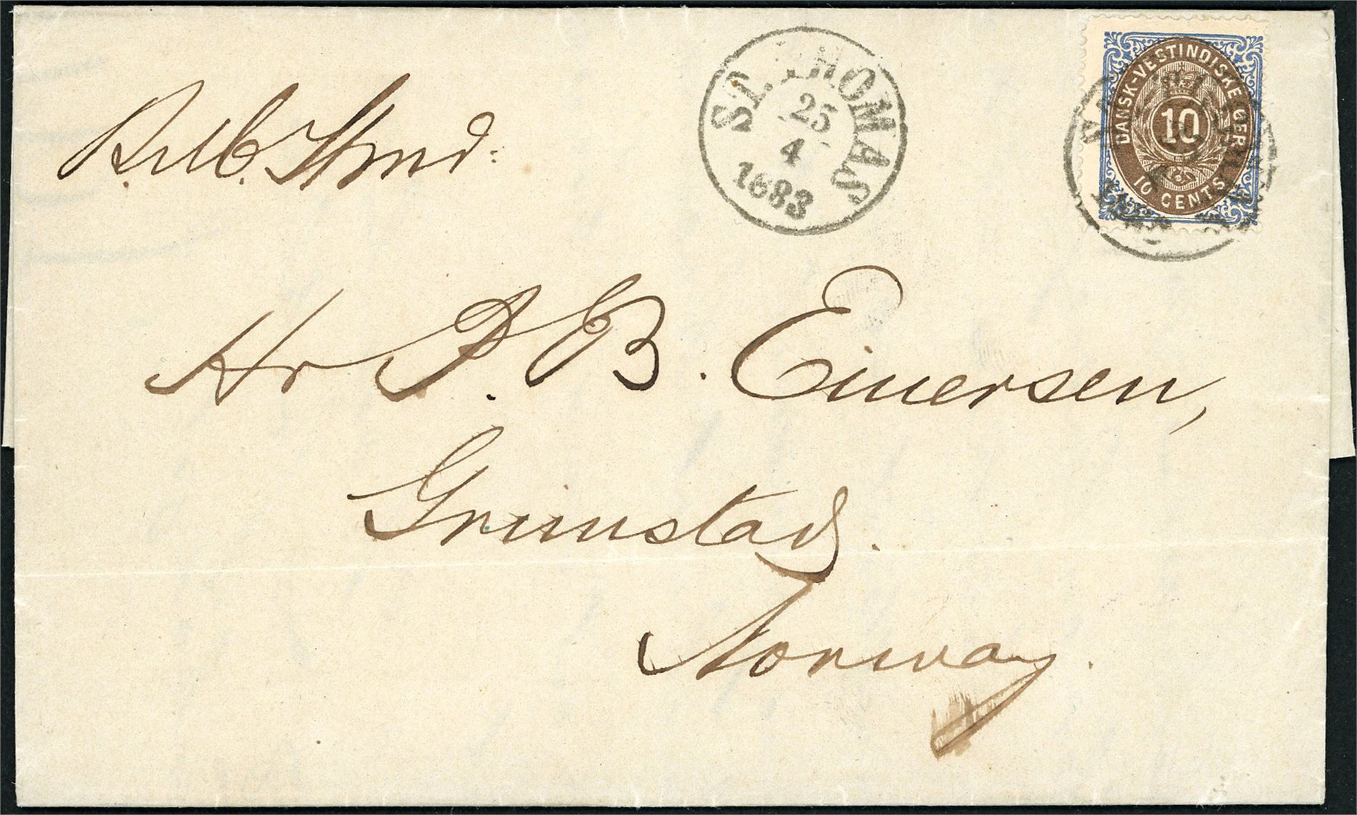 DWI. 10 c on complete letter, cancelled "St. Thomas 25.4.1883" and sent to Grimstad, Norway.