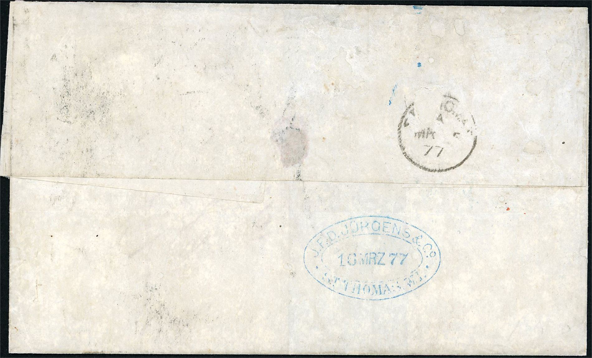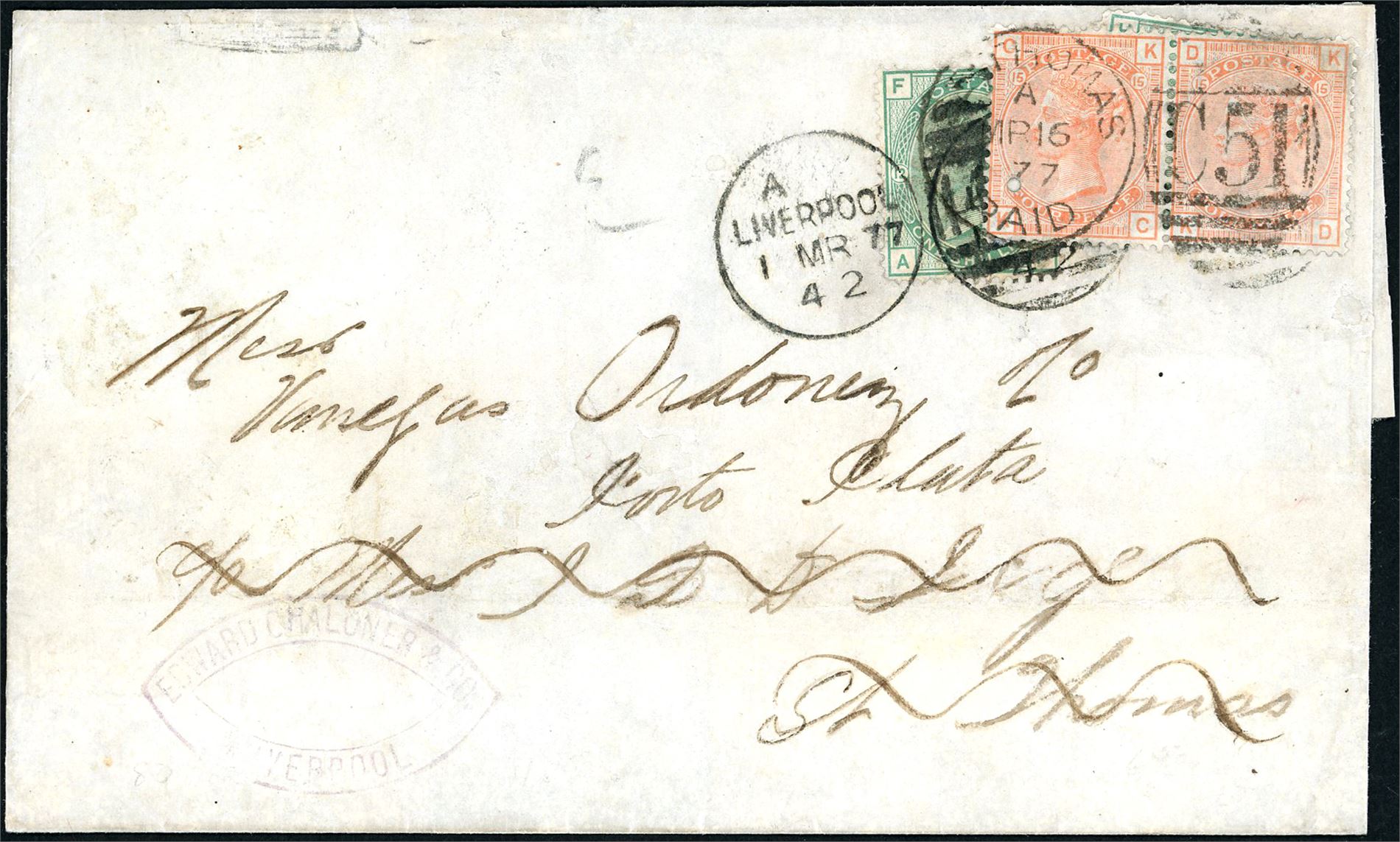 DWI. Two 1/- green on dobbelweight letter, cancelled "Liverpool 1 Mr 77 42" and sent to J.F.D. Jurgens, St. Thomas, who have forwarded the letter to Haiti with to 4d orange (plate15) and cancelled "St. Thomas Paid Mr 16 77".
