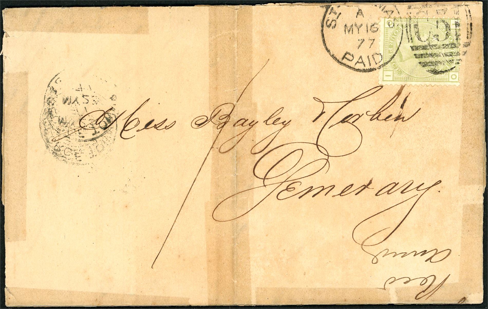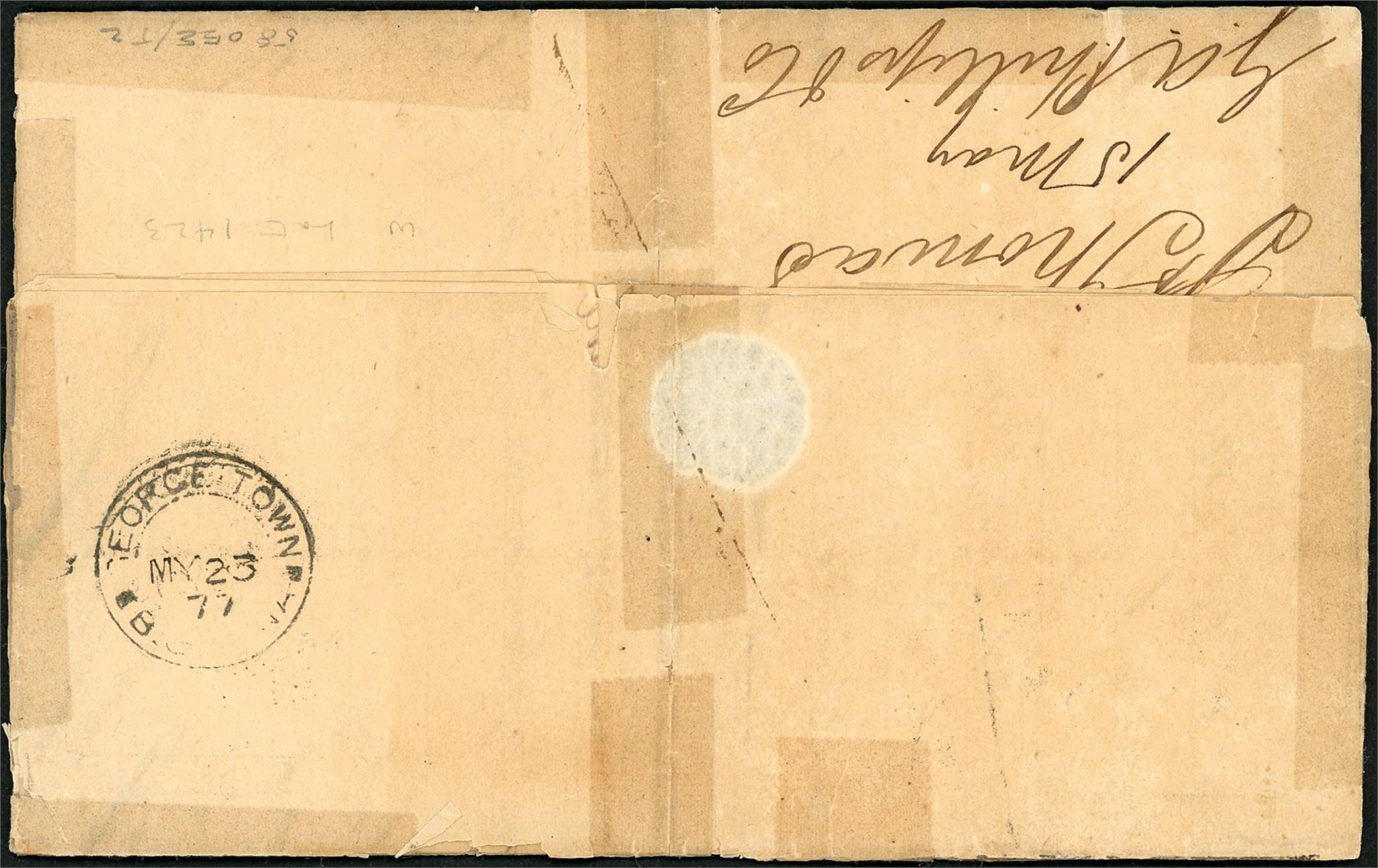 Z 12/153. DWI. 4d olivengreen (plate 15) on cover, cancelled with duplex cds "C 51 St. Thomas Paid A My 16 77" and sent to Georgetown, British Guyana. Arrival postmark at reverse. Marks on all the side and at the middle.