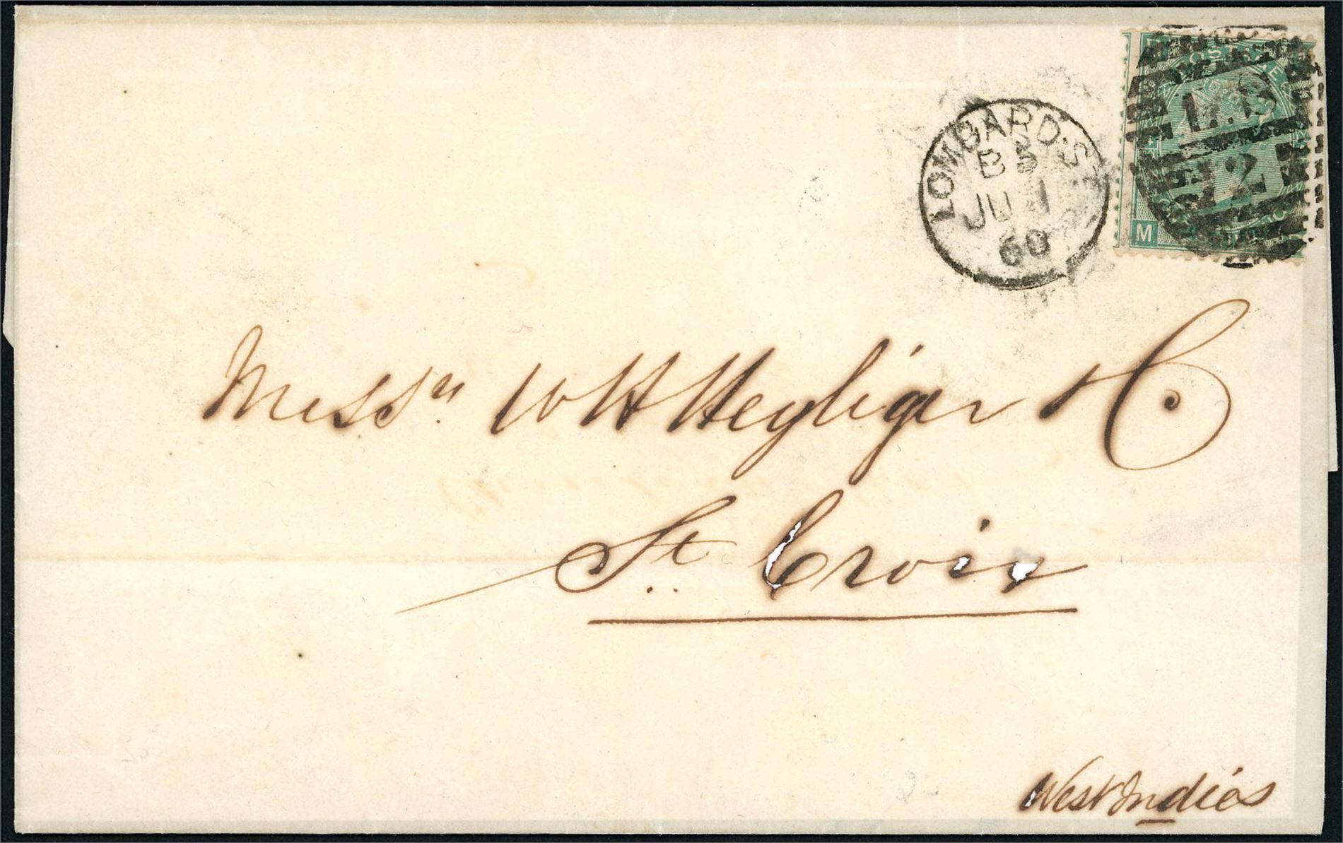DWI. 1/- green on cover, cancelled "Lombard St. B5 Ju 1 68" and sent to St. Croix, West indies. Some holes around "Croic" because the ink.