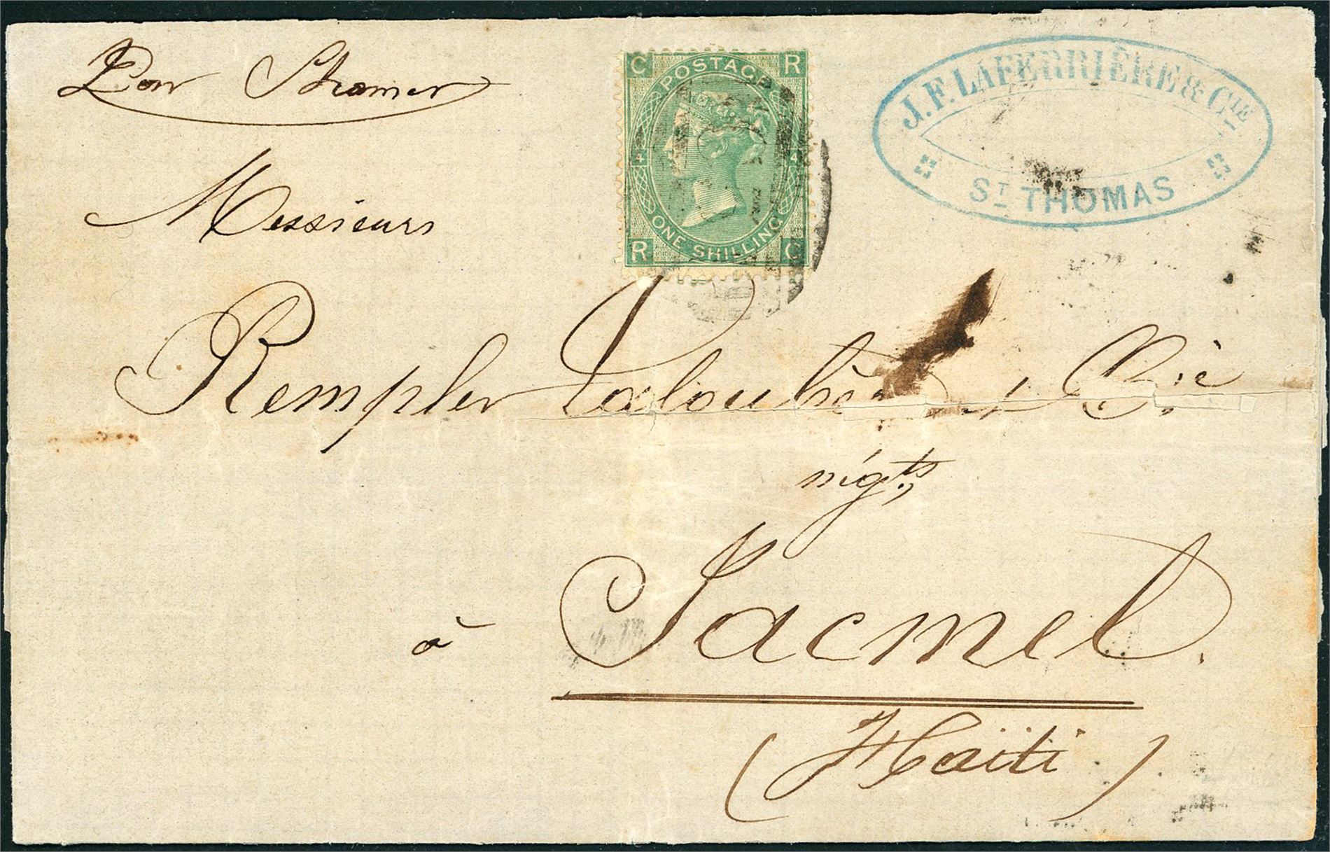 Z 28/101. DWI. 1/- green (pl 4) on cover to Haiti in 1865, cancelled "C 51", and the senders name "J.F.Laferriere &Co, St Thomas" at side. "St. Thomas Jy 17" with single circel at reverse (This flap is detached from the letter itself). British stamps had introduction date 3.7.1865. The stamps is OK, but the letter is worn. This is one of the earlieste known letter used with stamps from DWI.