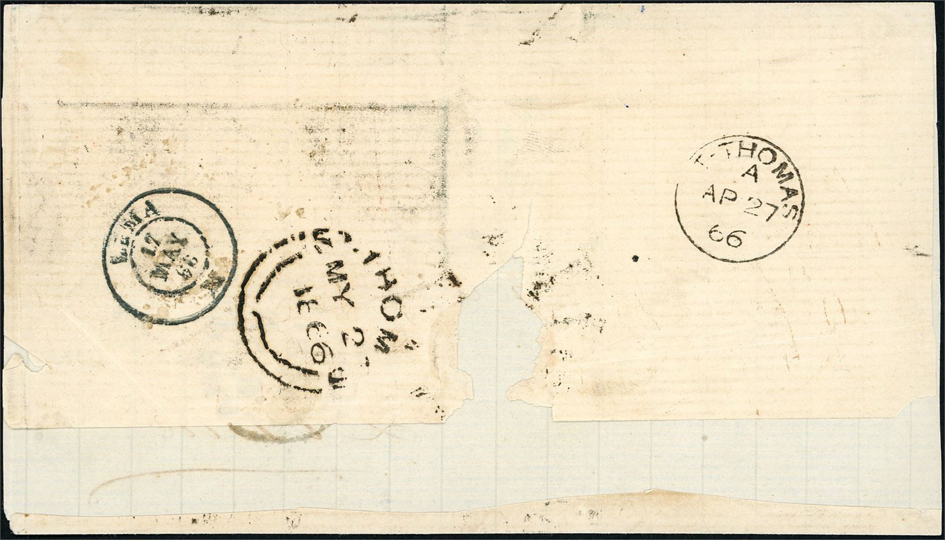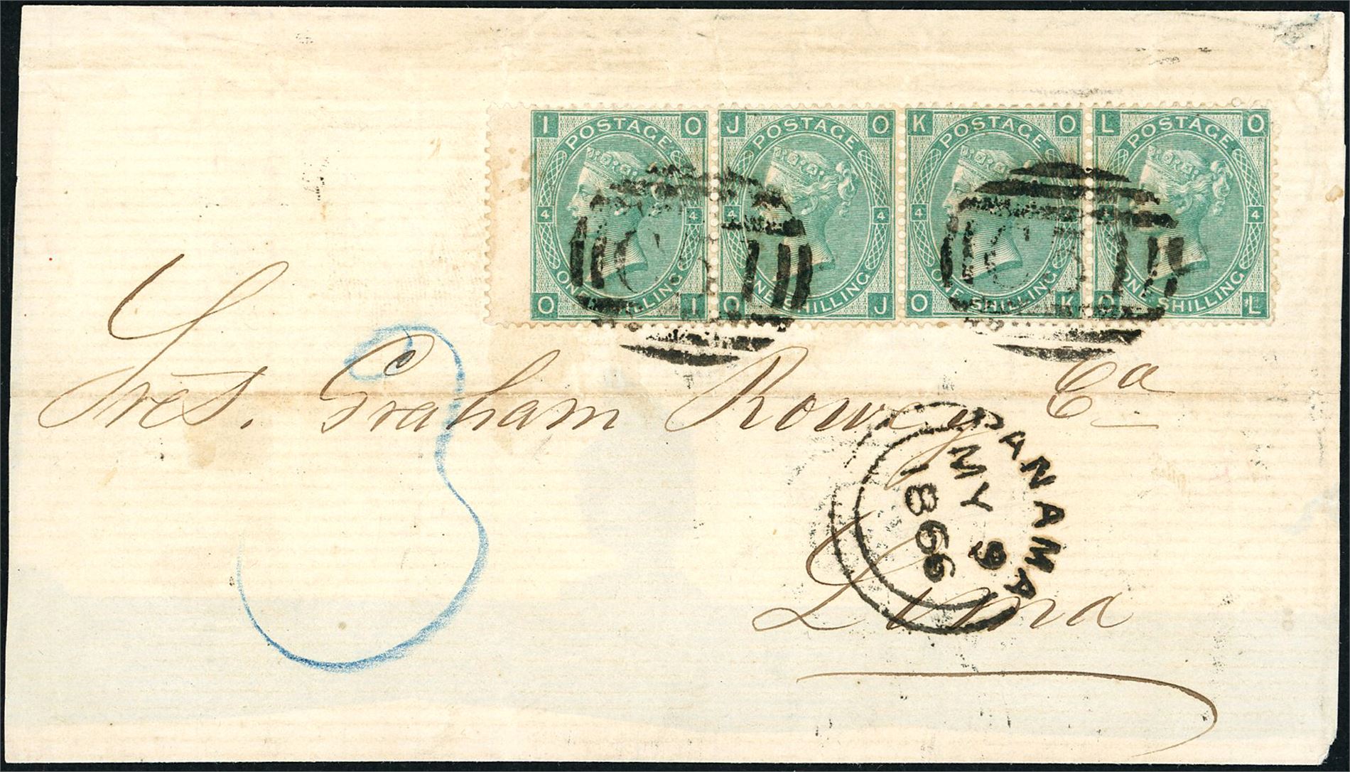 229. DWI. 4/- postage to Peru. The 1/- green (pl 4) in a horizontal strip of 4 on coverfront with a big part of the reverse, cancelled "C 51" and sent to Lima. Transitt cds "Panama My 9 1866" at side. Two different "St. Thomas" cds together with "Lima 17 May 66" at reverse.