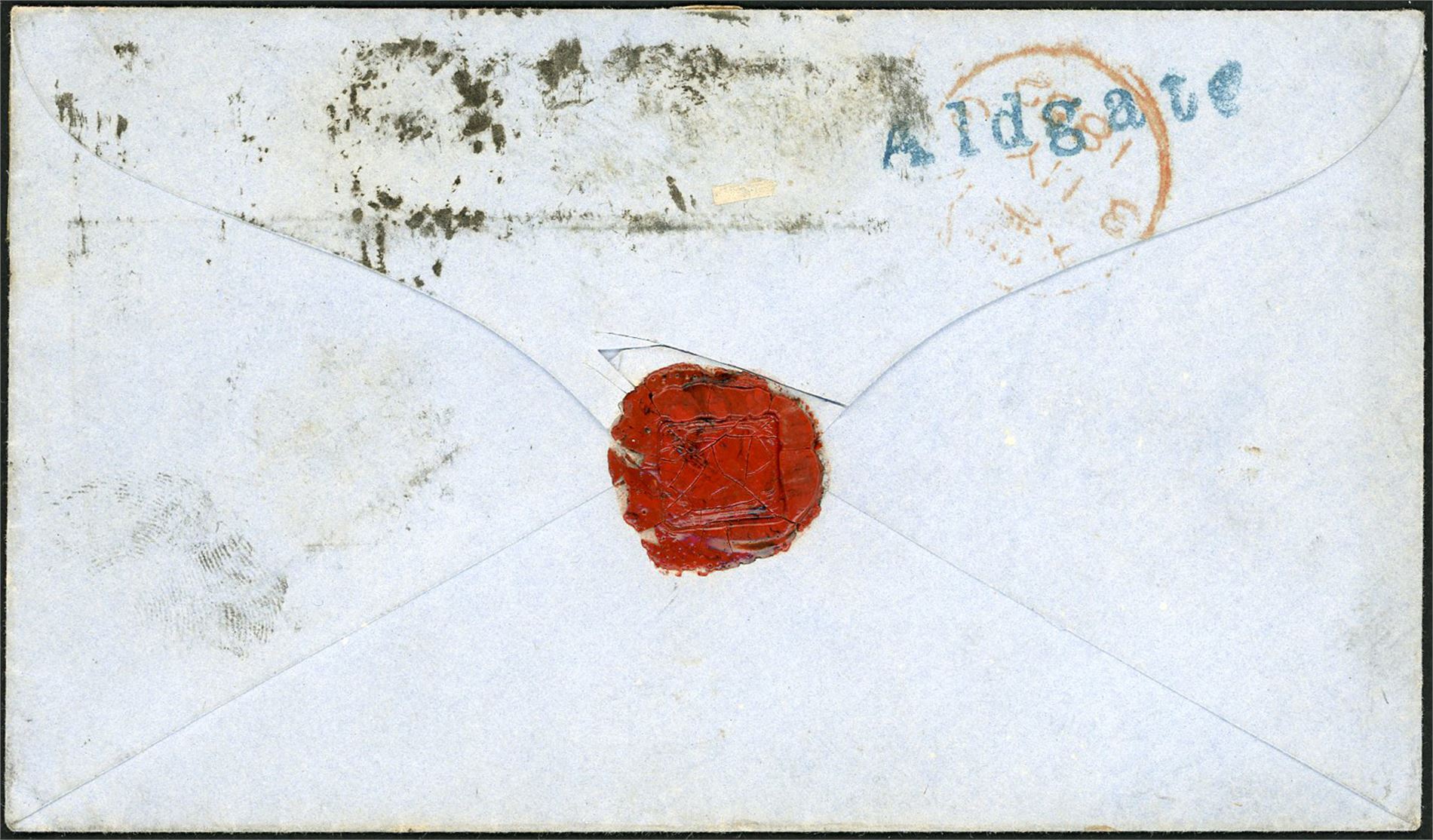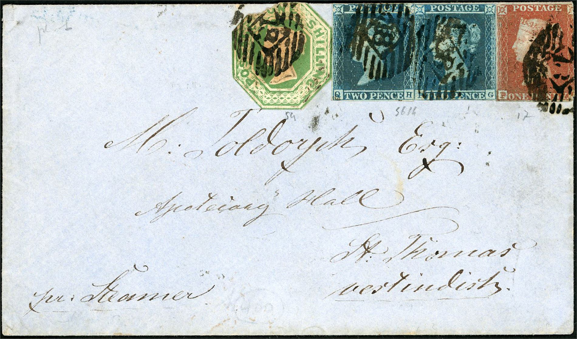 DWI. 1d, two 2d line engraved and one 1/- embossed on envelope from Aldgate, England to St. Thomas in 1852. A line postmark "Aldgate" in blue and a red "3 My 1852" at reverse. The stamps are with tight margins or gut into. Very early use of stamps to DWI, and maybe one of the two earlieste known. Ex K.Klugman.
