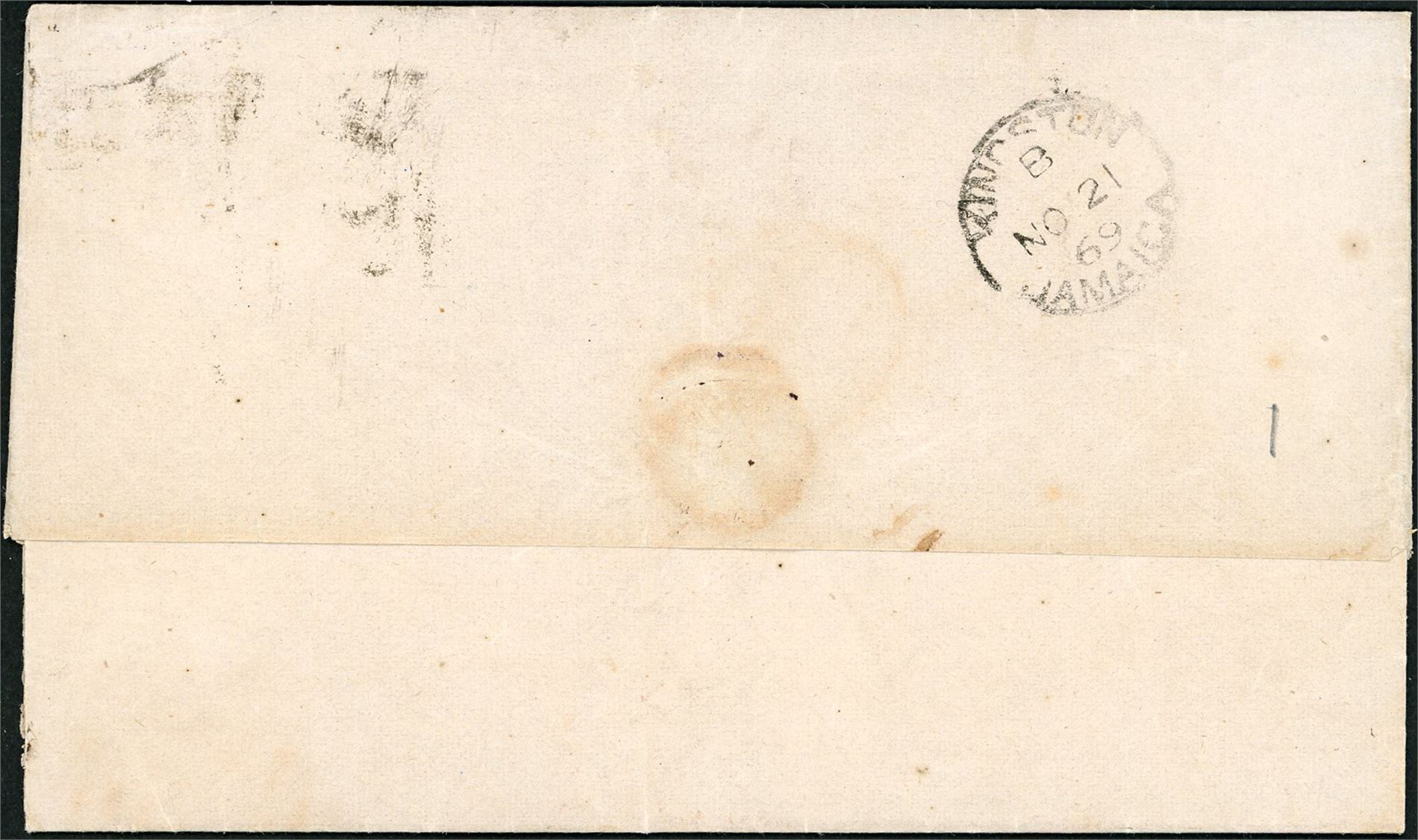 Z 10/95. DWI. A 4d orange (pl 111) on complete cover to Kingston, Jamaica, cancelled "C 51" and "St Thomas No 7 69 Paid" in red at side. Arrival postmark "Kingston Jamaica B No 21 69" reverse. One of of the earlieste letter known to Jamaica. A quite heavy horizontal arciv crease, but still a nice letter.