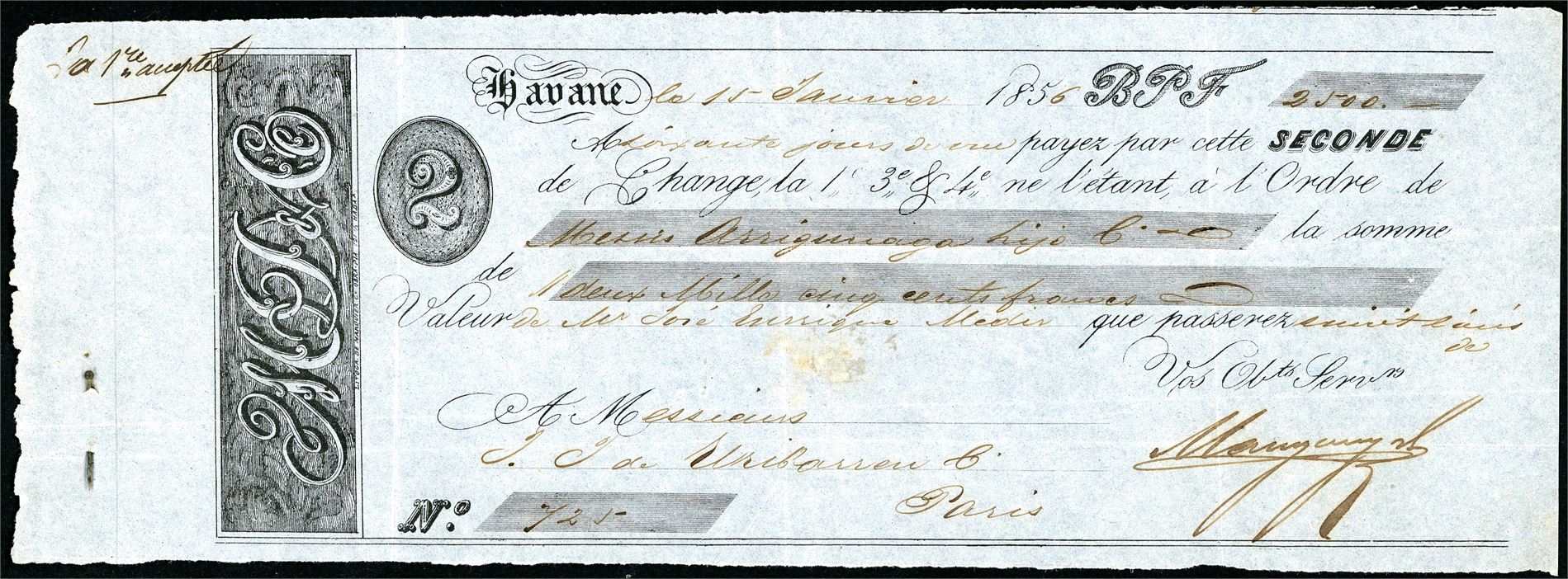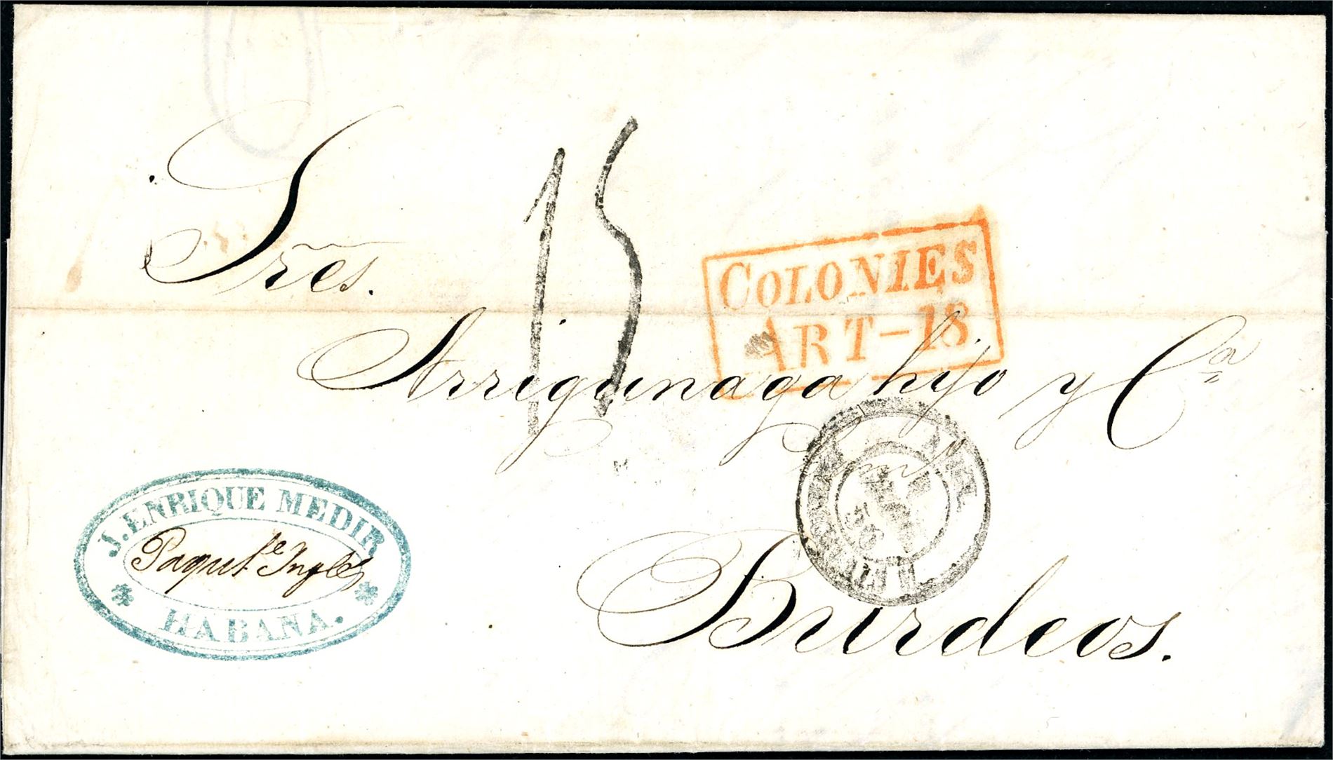 DWI. Unfranked letter (duplicated letter) from Habana, Cuba to Bordeaux, France, cancelled "Havana MR 10 1856 A" on reverse together with "Paris Bordeaux" and "Bordeaux 3 Avril 56". The rare British/French convention postmark "Colonies Art-18" in red and French postagenumber "15" (Decimes) at front. The letter had a bank-check on 2500,- attached, and this still follow the letter.