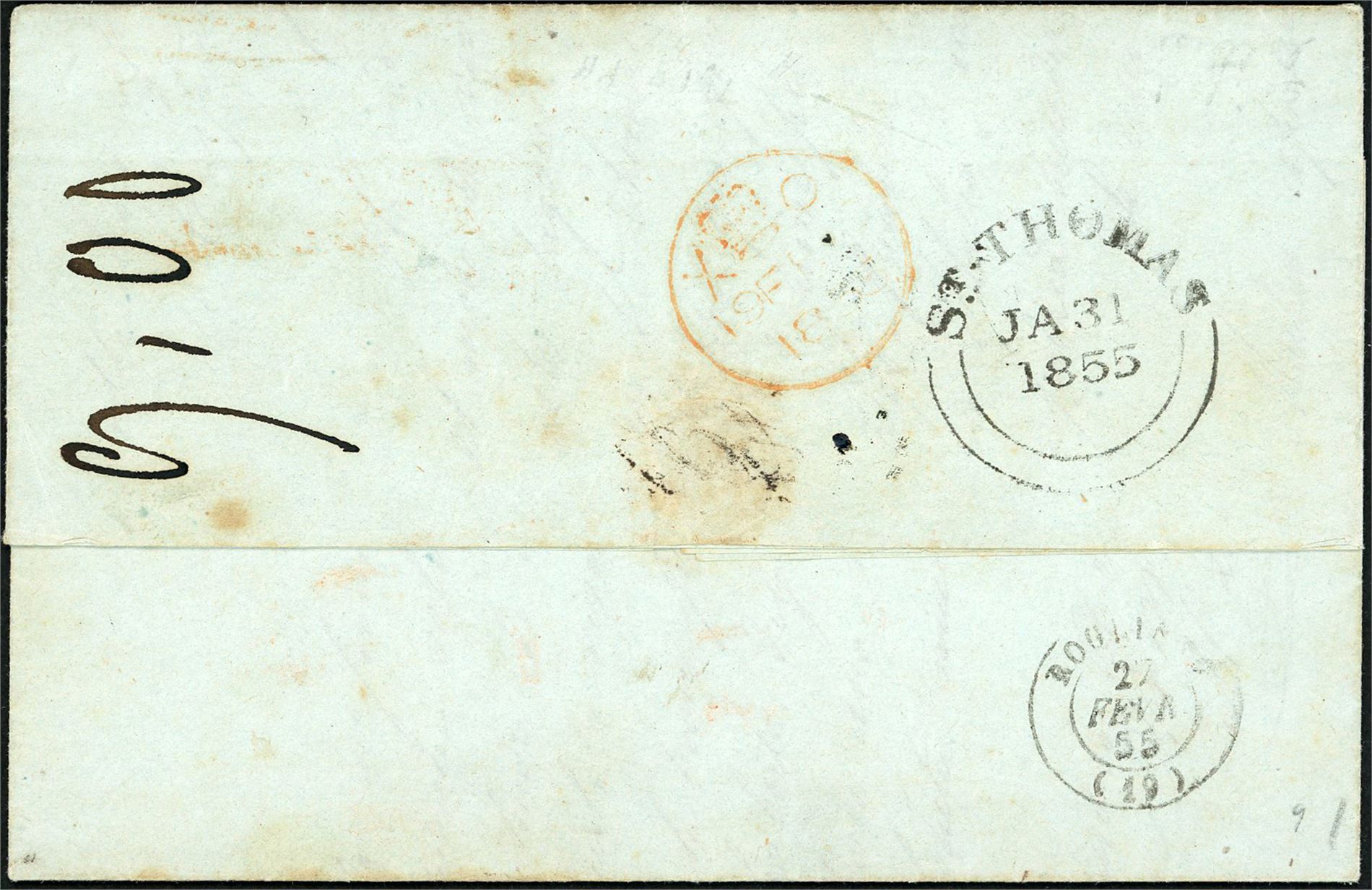 DWI. Complete letter, dated "St. Thomas 30 Euro 1855" and with postmark ""St.Thomas Ja 31 1855" at reverse and sent to Corsica, France. British/Frensh convention postmark "Colonies &c.Art.13." on the front.