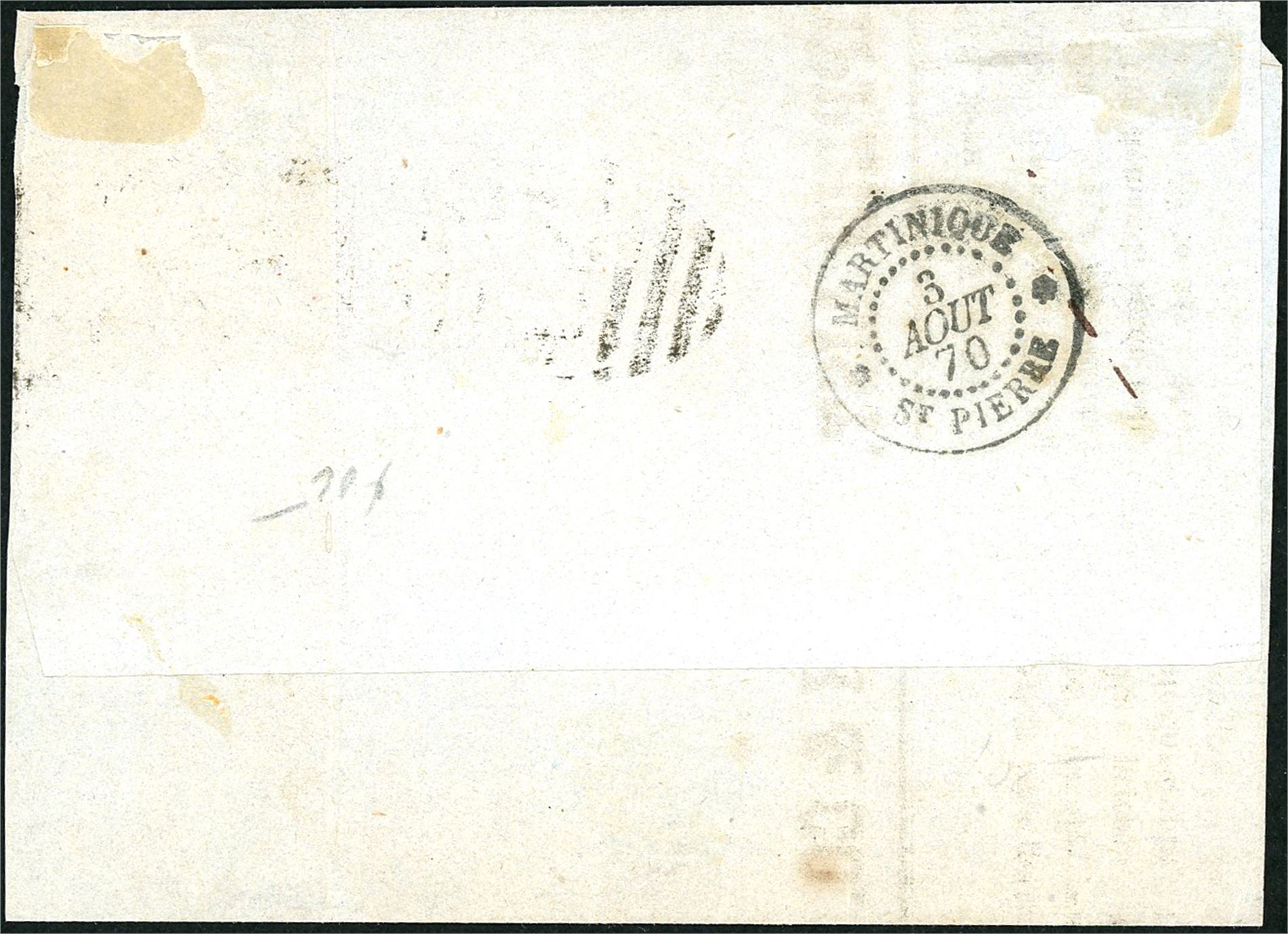 DWI. 1d red (pl 125) on wrapper for a printed matter, cancelled "C 51" and "St. Thomas Paid A Jy 30 70" in red beside, and sent to St. Pierre. "Martinique St Pierre 3 Aout 70" cds at reverse. A vertical crease goes through the stamp.