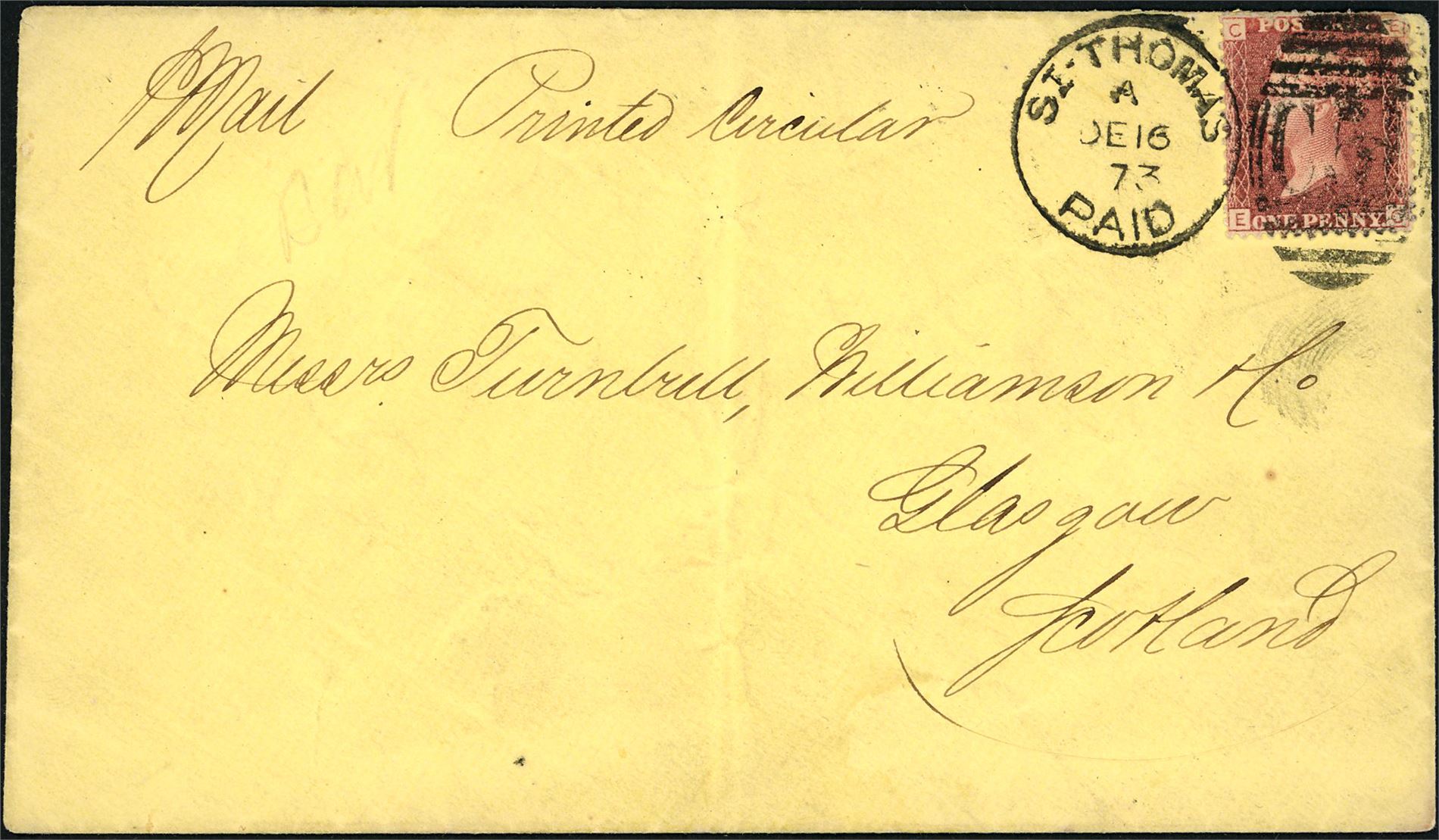 DWI. 1d red on envelope for "Printed Circular", cancelled with duplex "St-Thomas Paid A De 16 73, C 51" and sent to Glasgow, Scotland. Ex. K. Klugman.
