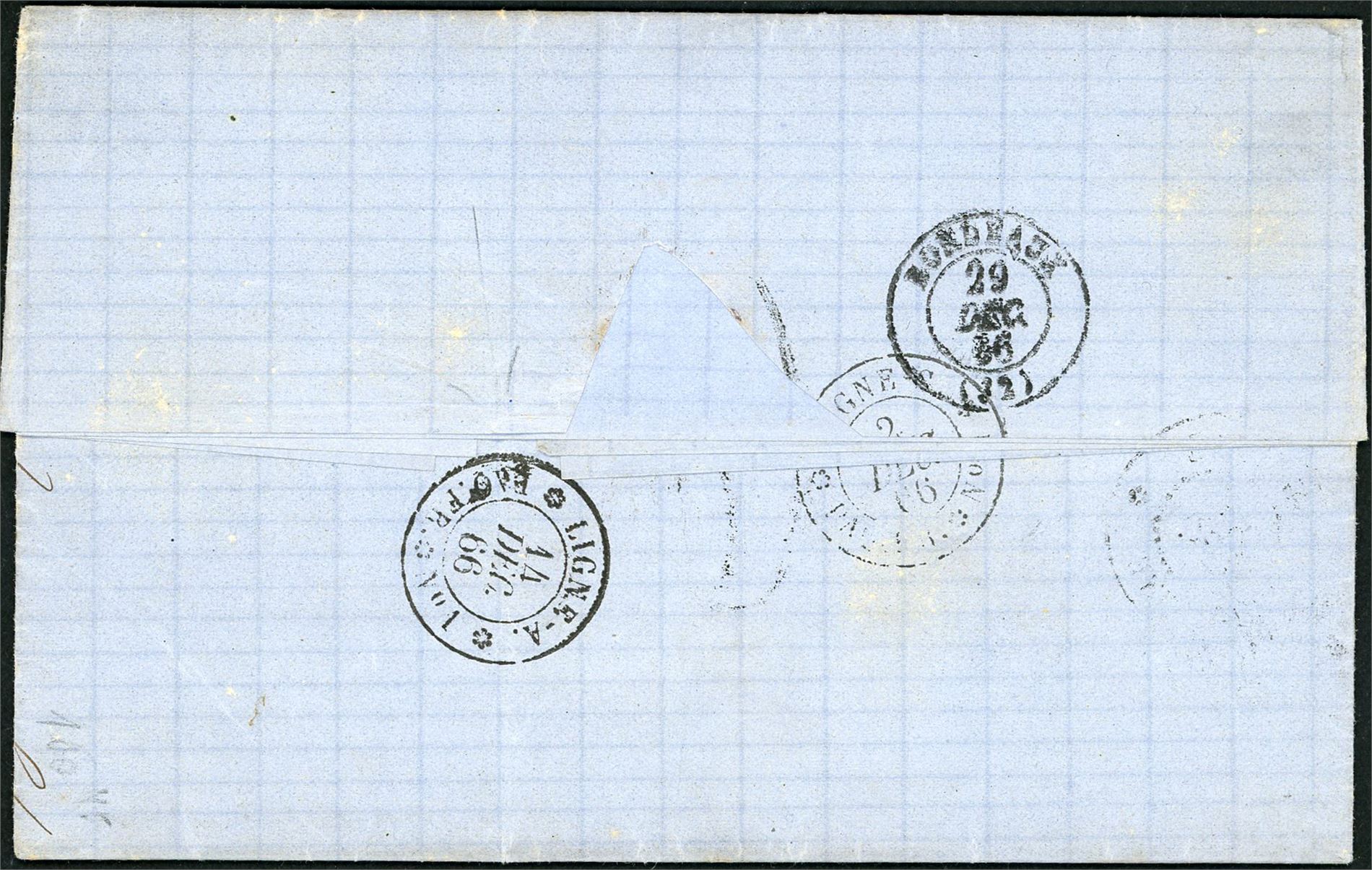 DWI. A complete letter from Cayenne, French Guiana to Bordaux, France with "Guyane Cayenne 1 Dec 66" postmark an French postage number "6" at front. On reverse three postmarks: "Ligne C 2 Dec 66" and "Ligne-A. 14 Dec 66" and arrival postmark "Bordeaux 29 Dec 66".