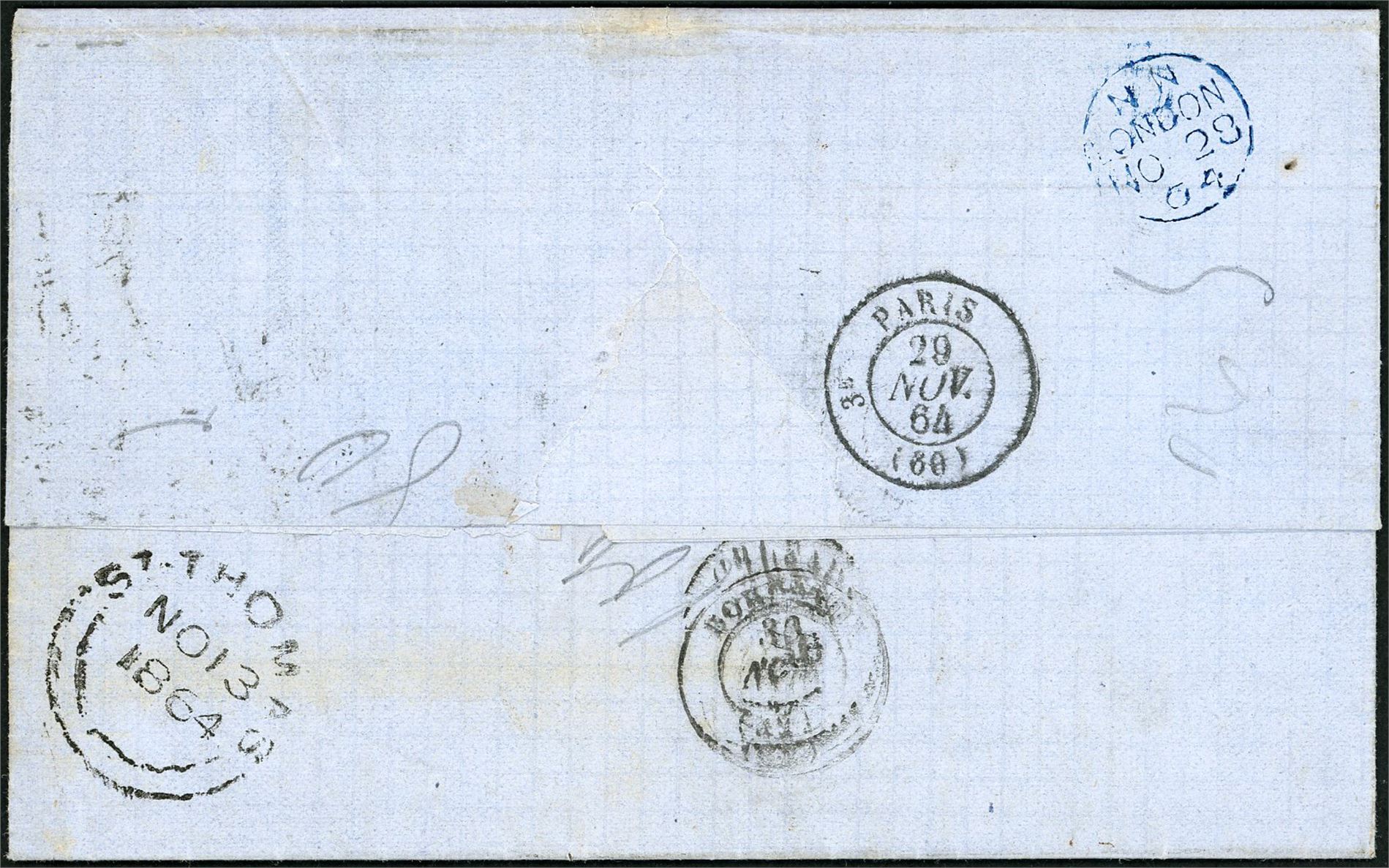 DWI. A complet letter, dated "Saint Thomas 12 November 1864" and sent to Bordeaux. "GB 1F60c" in box, "Angl. Calais28 Nov 64" and French postage number "8" at front. "St Thomas No 13 1864", "N N London No 28 64", "Paris" and arrivalpostmark at reverse.