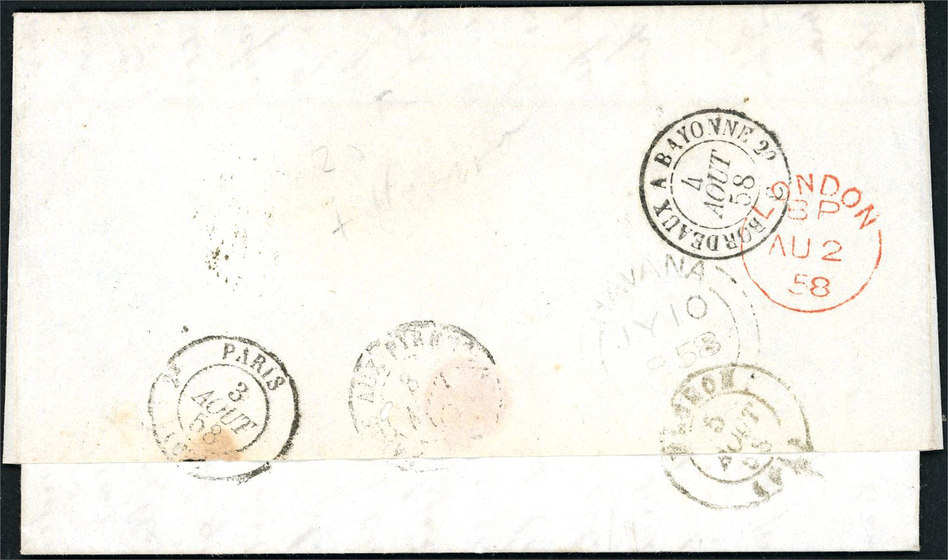 DWI. A complete letter, from Cuba to France in 1858 with "GB 1F60c" and "Angl. Calais" postmark at front together with a light "8" (centimes). At reverse "Havana Jy 10 1858", "London BP Au 2 58" and four French postmarks.