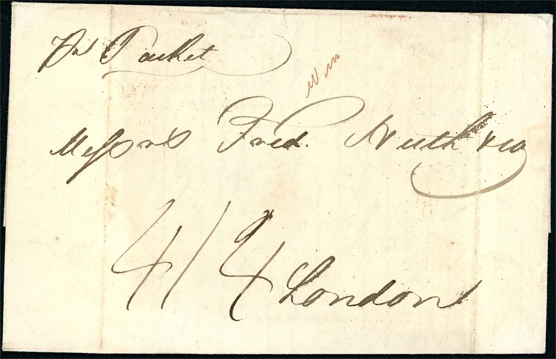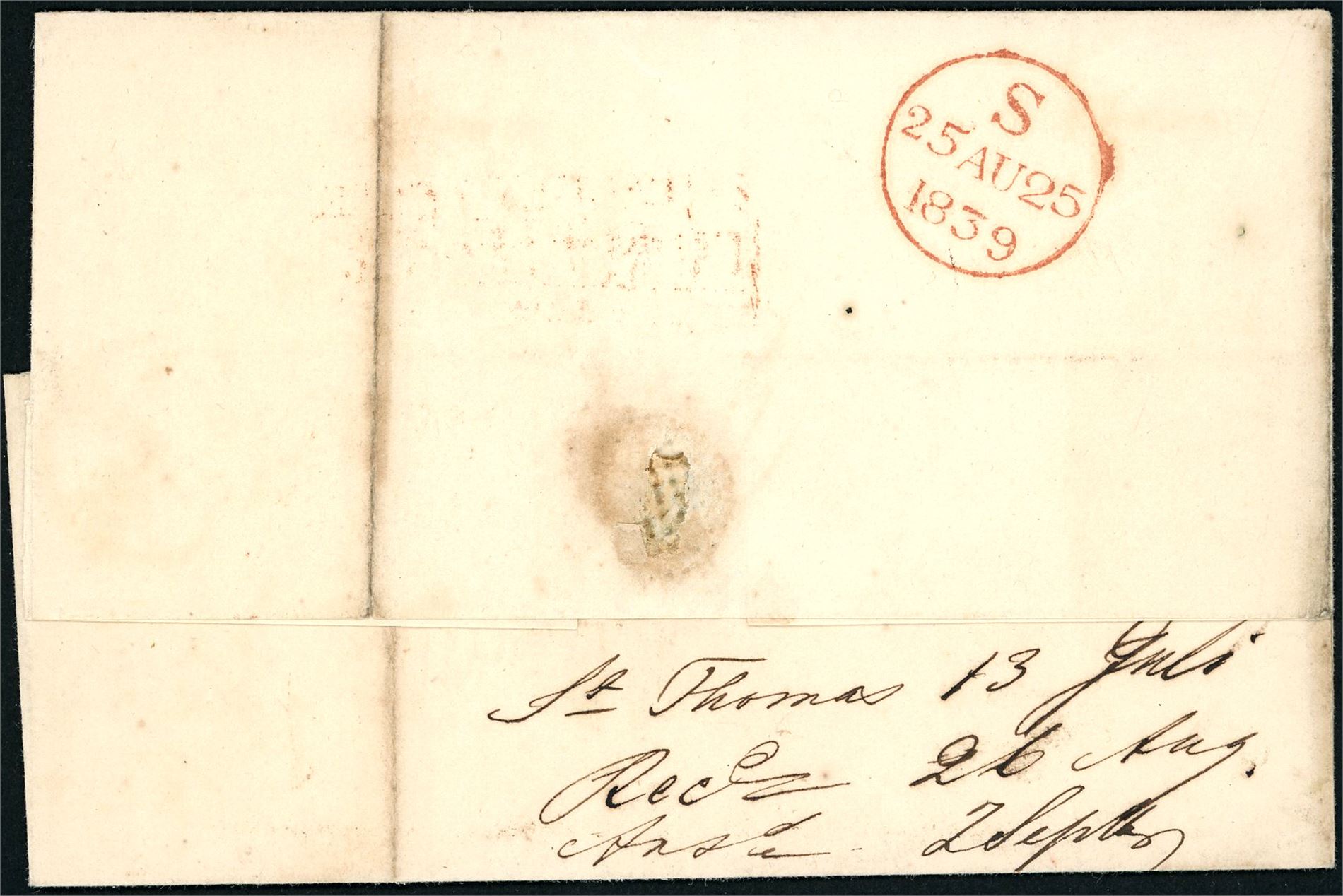 Two "pr Packet"-letter from St Thomas to London: One complete with "Packet Letter" (in box) and "E London 1834" on reverse. This is a "Duplicated letter". The other is en entire with "S 25 Au 25 1839" postmark on reverse. Both with archive crease.