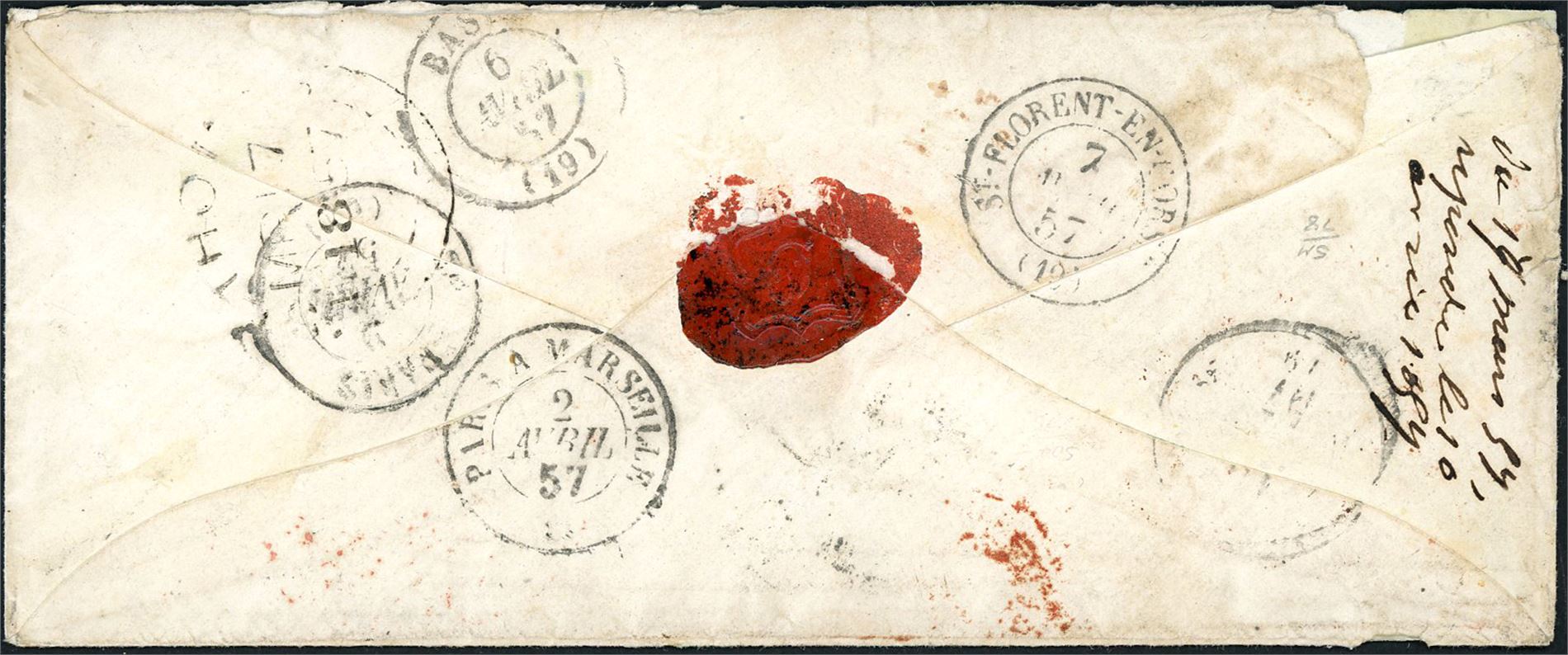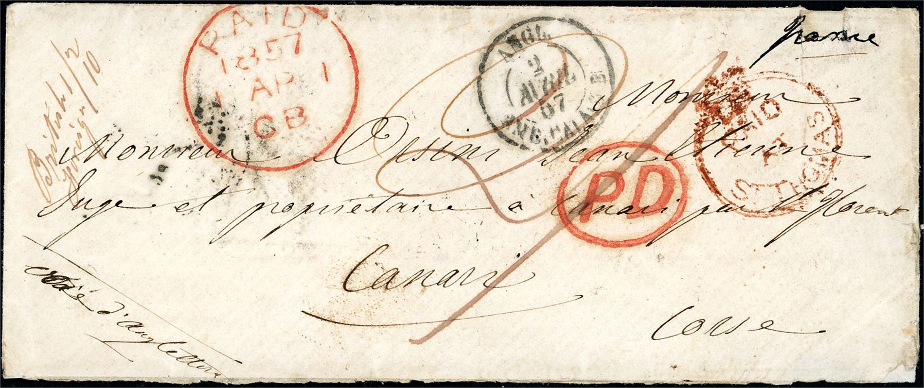 DWI. Unfranked envelope, with "Paid AT St. Thomas" postmark, red "PD", "Paid 1857 AP 1 GB" in red and French "Angl. Amb. Calais 2Avril 57" on the front. On reverse one "St Thomas" postmark and 5 from France. (5256225)
