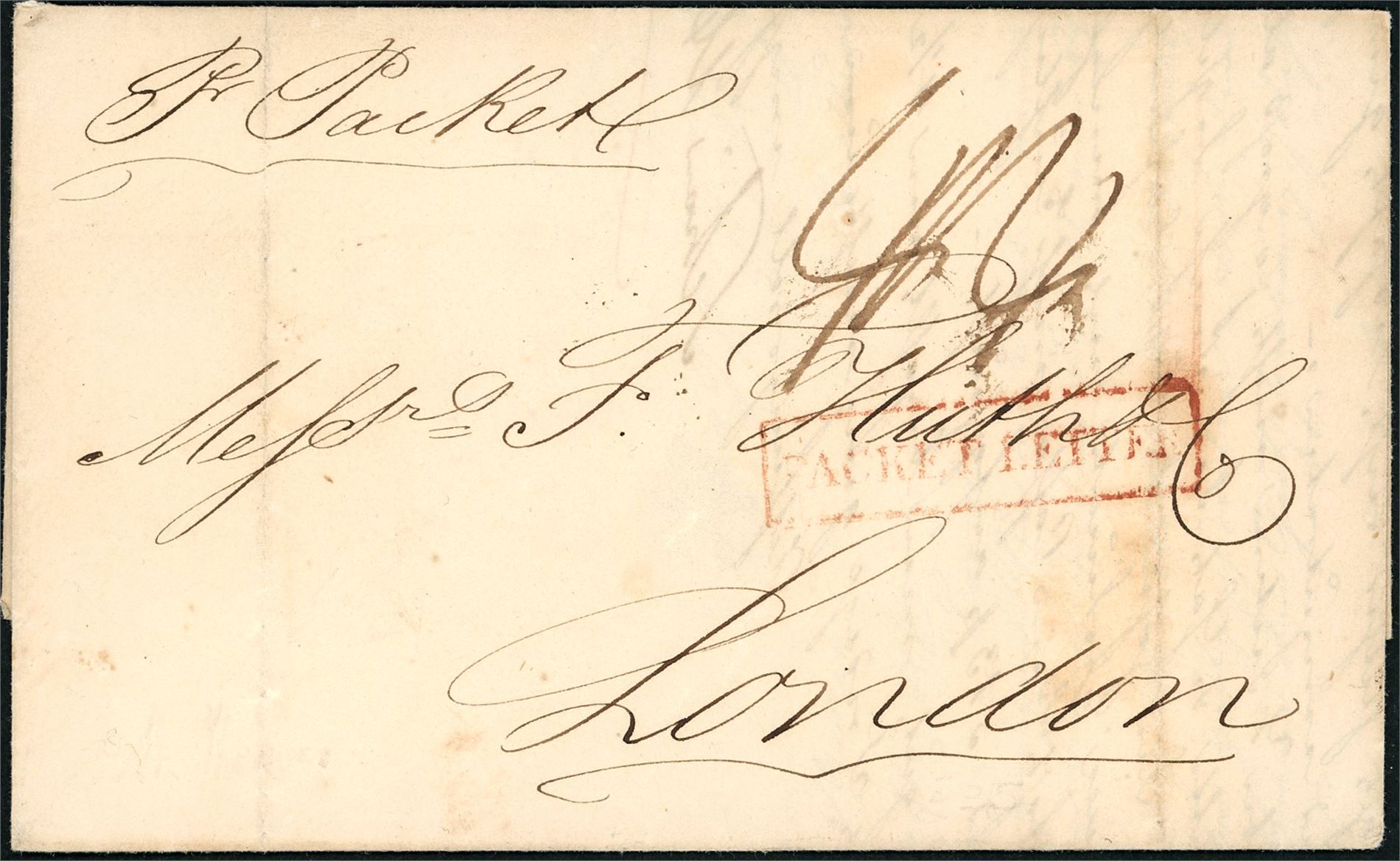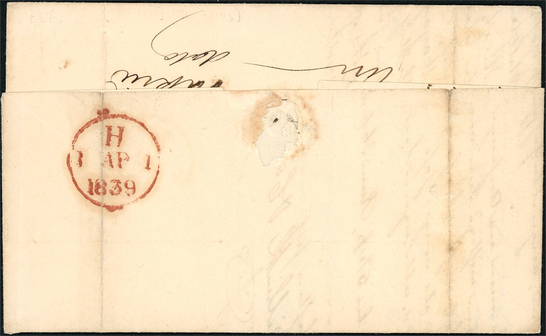 DWI. A complete letter dated "St. Thomas 27 January 1839", with handwritten "pr Packett" and red "Packet Letter" postmark on front. "H 3 AP 1 1839" in red at reverse.