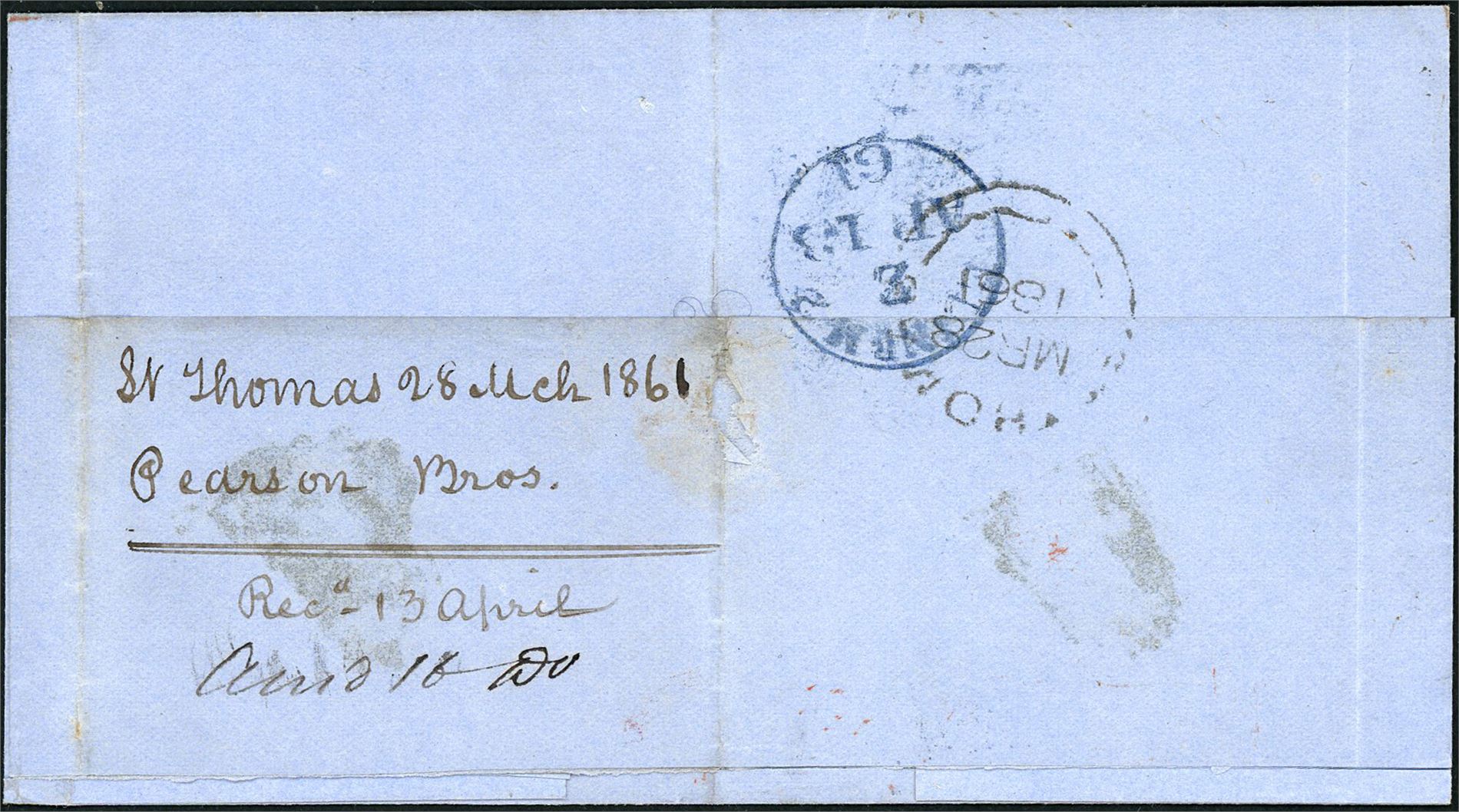 DWI. Entire with "Paid At St. Thomas" postmark in red at front together with postagenumber "6" and transitt cds "London Paid C5 AP 12 61". "St. Thomas Mr 28 1861 " and a blue English postmark "AP 13" at reverse. Two of the flaps on the letter are cut of.