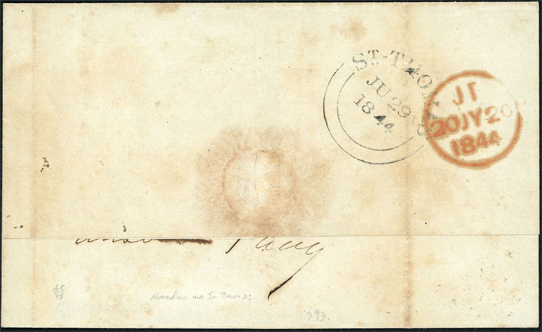 DWI. Entire dated "Aguadilla 19 July 1844" (Puerto Rico) and sent via "St Thomas Ju 29 1844" (dobbel circle postmark at reverse) to London. Also a red "JI 20 JY 20 1844" at reverse. Handwritten "By way of St Thomas" on lower left corner on the front. A vertical crease and some stain. (5256665)