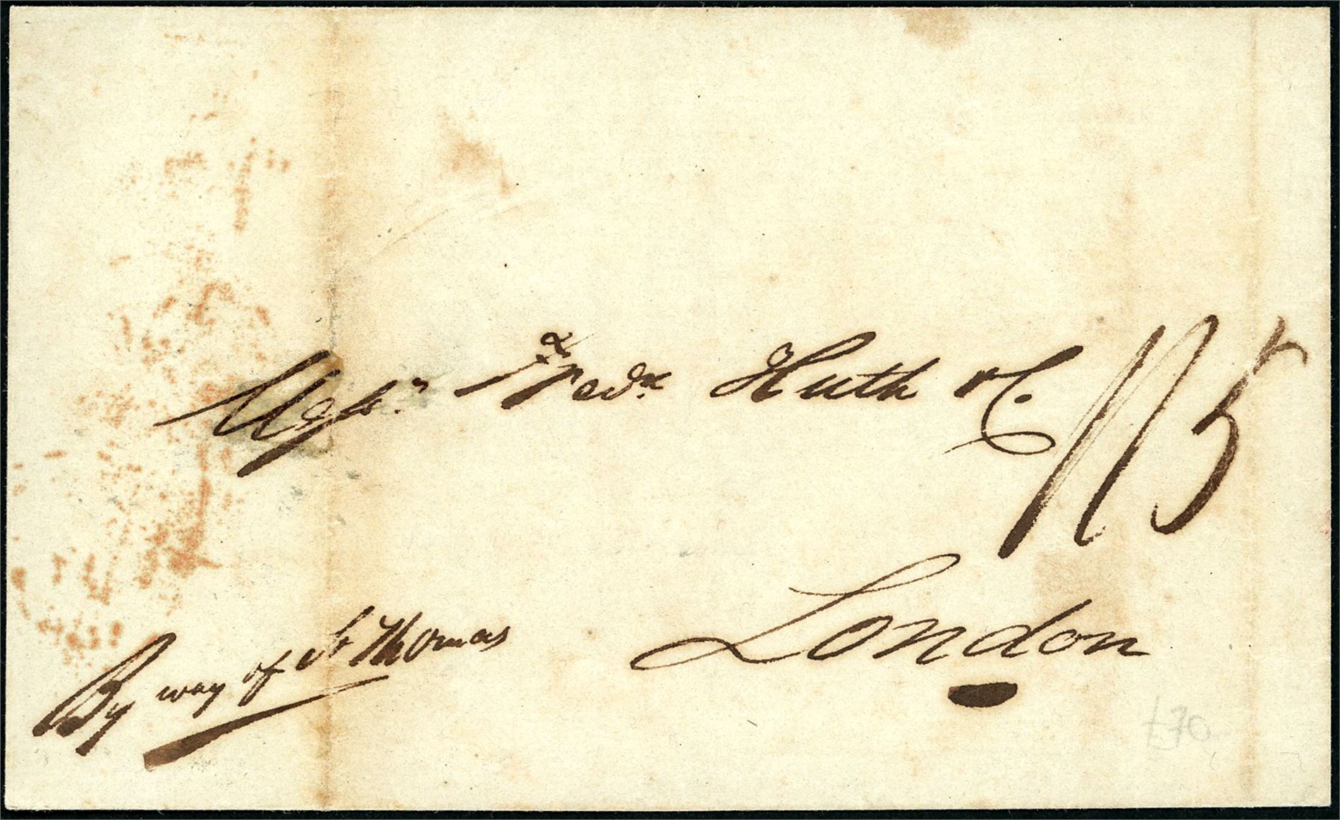 DWI. Entire dated "Aguadilla 19 July 1844" (Puerto Rico) and sent via "St Thomas Ju 29 1844" (dobbel circle postmark at reverse) to London. Also a red "JI 20 JY 20 1844" at reverse. Handwritten "By way of St Thomas" on lower left corner on the front. A vertical crease and some stain.