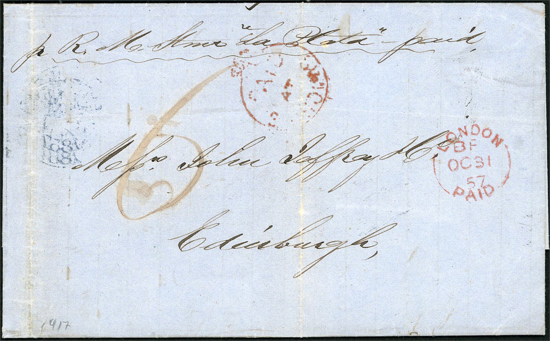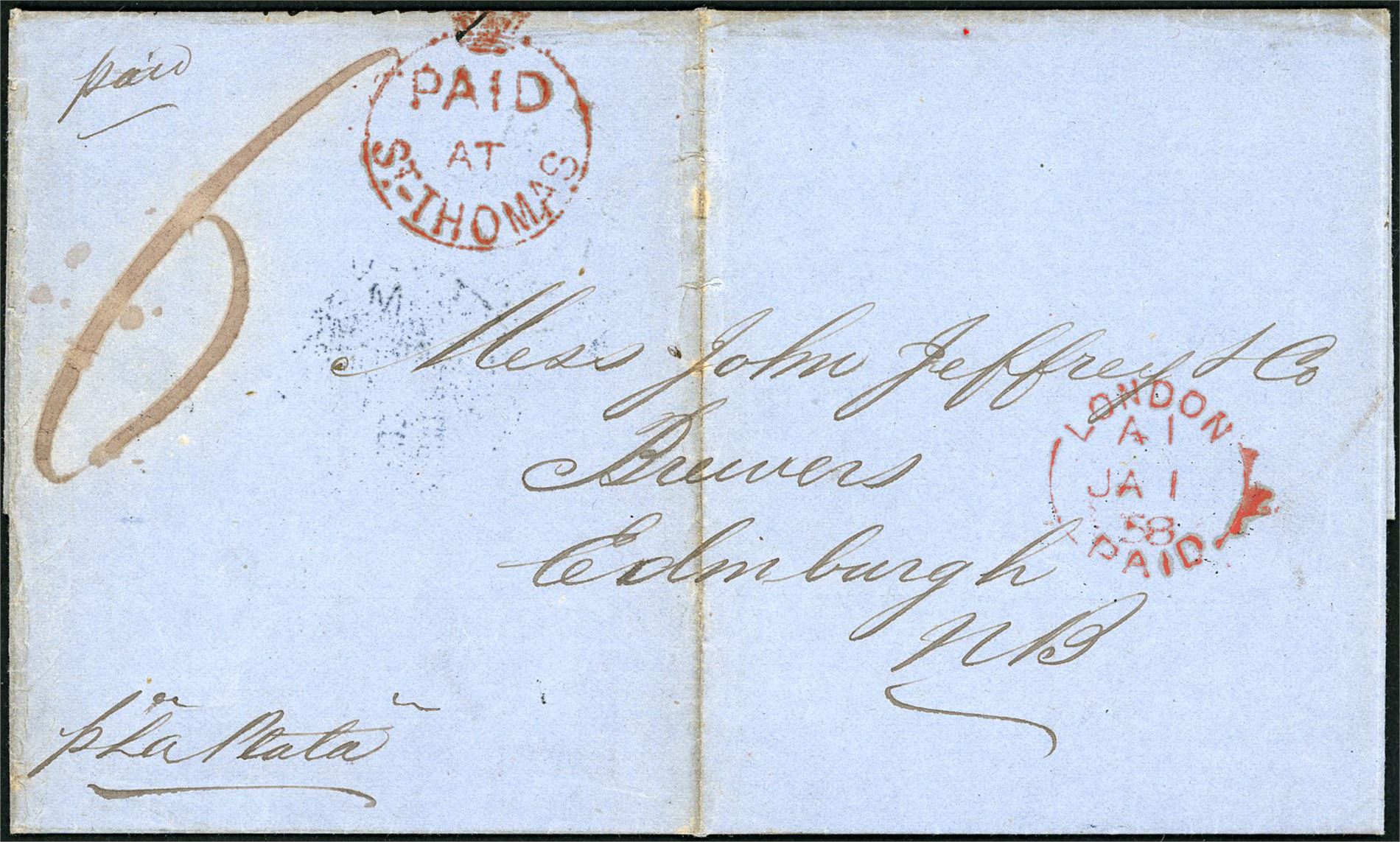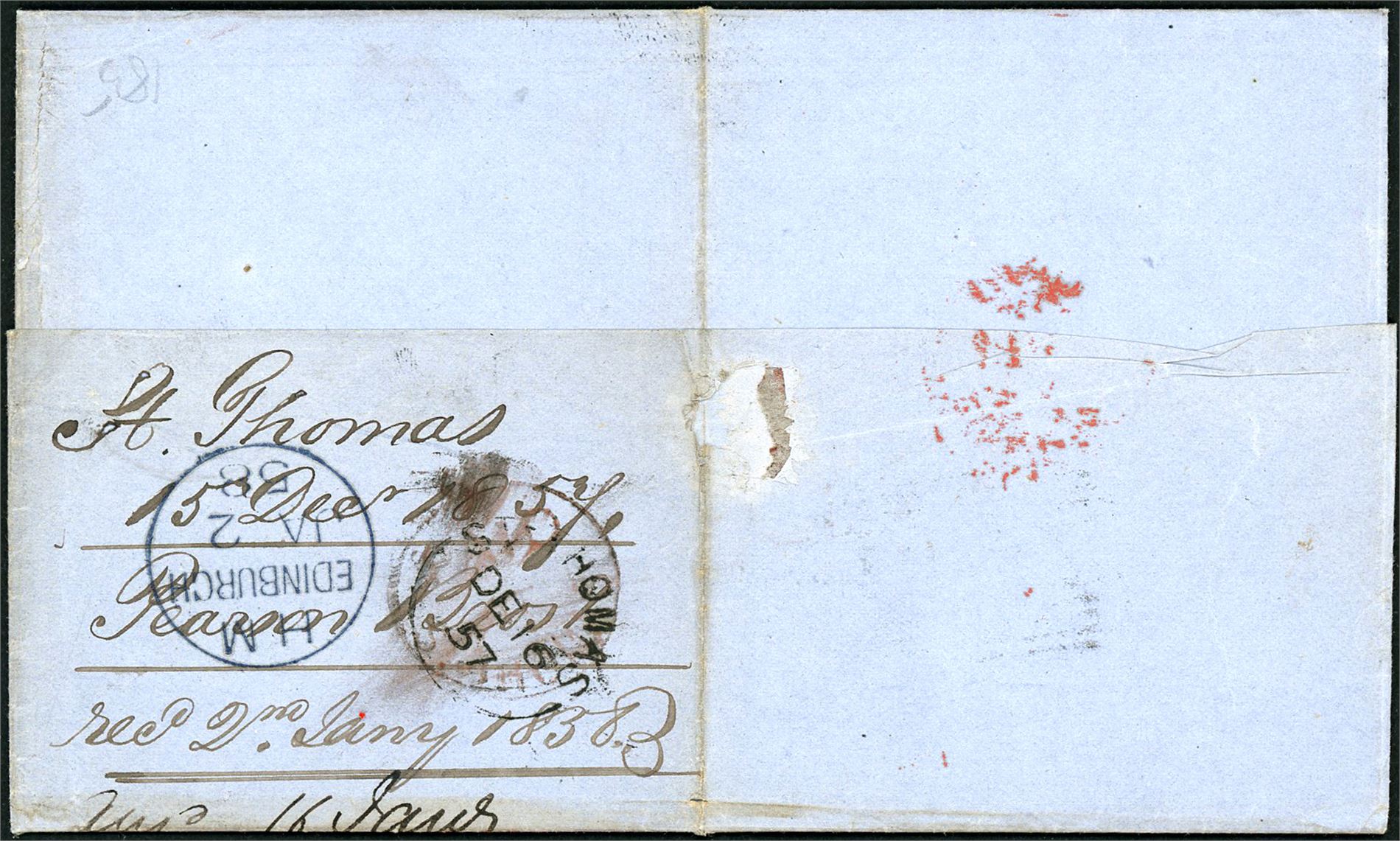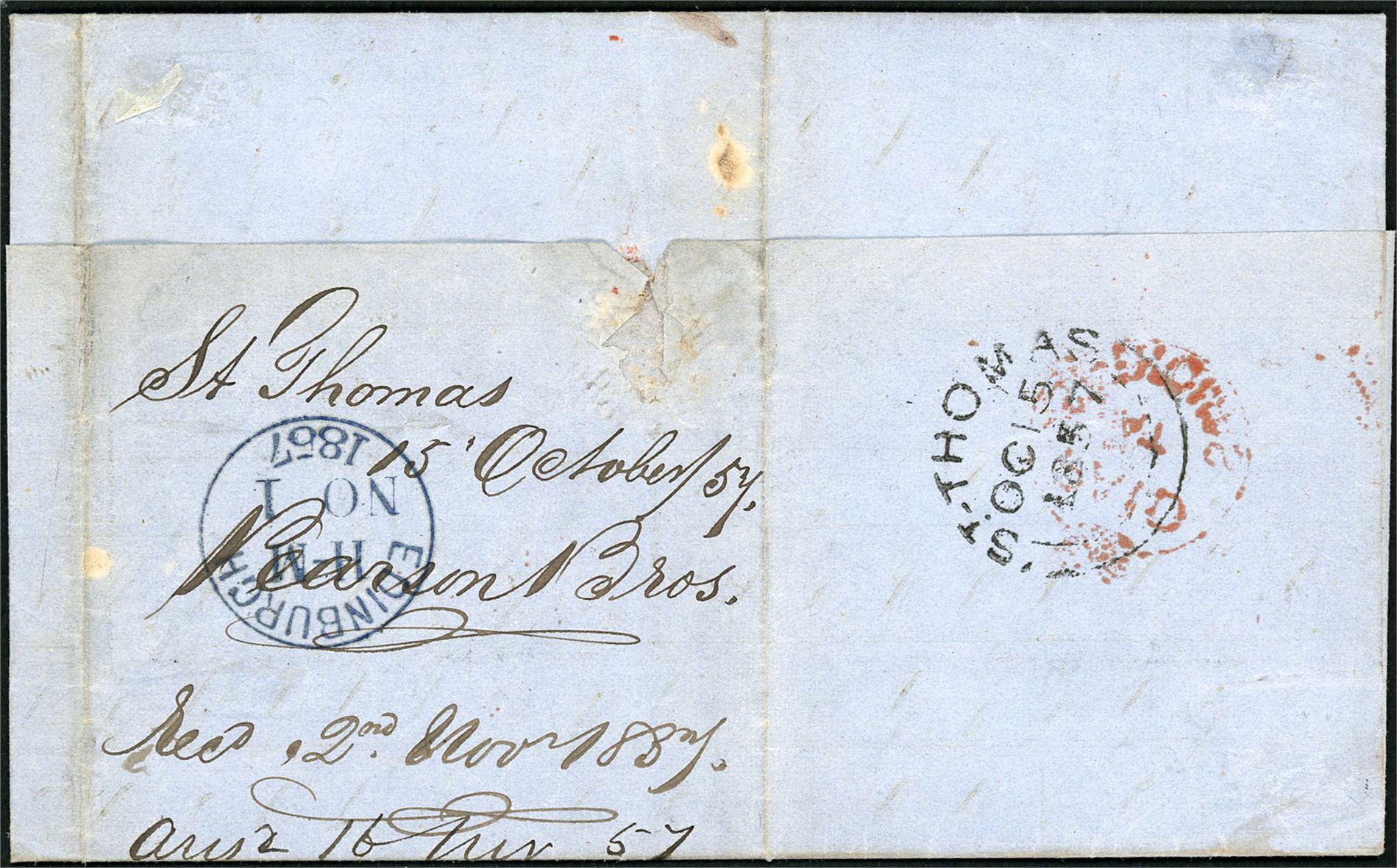 DWI. Two letters sent from St. Thomas to Edinburgh, Scotland in 1857 via London. One with the rare "single line"-postmark from "St Thomas De 16 57" at reverse. Both letters with a hard vertical crease.