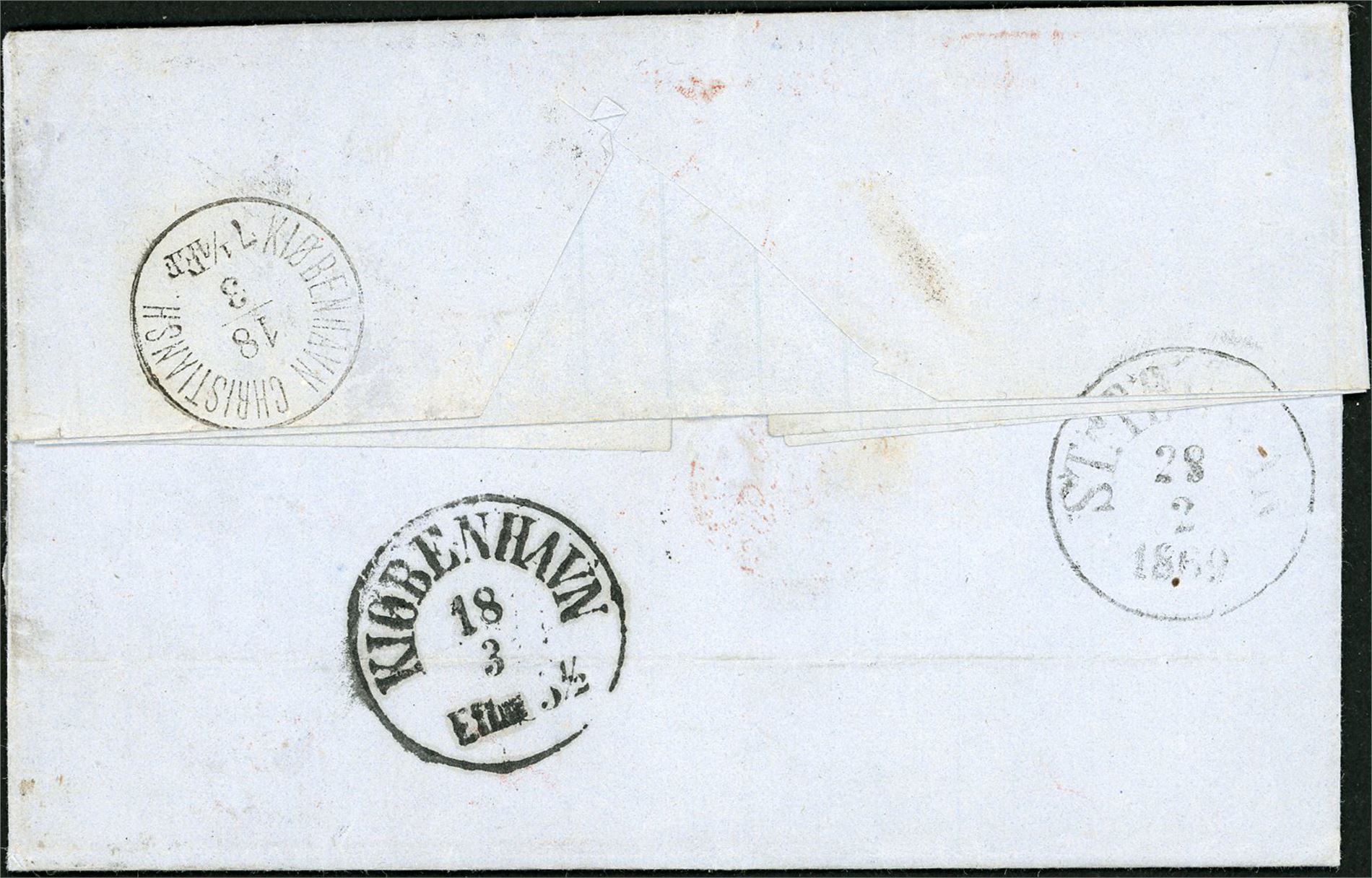 A complete letter, dated "St Croix 27 Feb. 1869", with "Christiansted 27.2.1869" postmark and "St Thomas Feb 28 69" and transitt "London Paid 16 Mr 69" at front. Postage rate 1 sh/3d is written in upper right corner, same place at British stamps has been removed from. At reverse it is three postmarks: "St Thomas 28.2.1869", "Kjøbenhavn 18.3" and "Kjøbenhavn Christiansh. 18.3".
