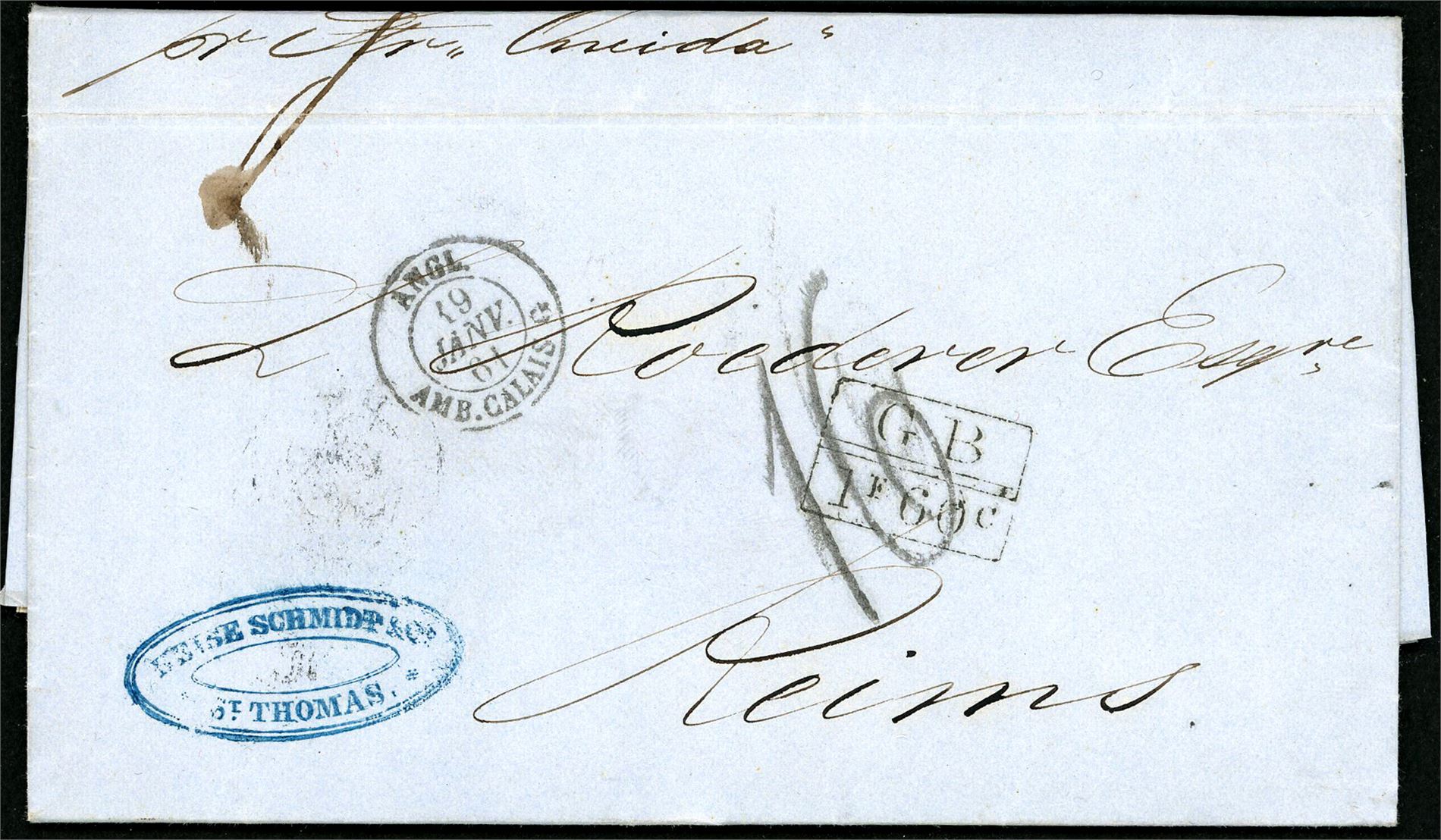 Two letter, both sent from "St Thomas" to Reims, France in 186 and 1861. Both sent with British Packet via "London", "Calais". British postagemark "GB 1F 60c" and French "16" (desimes) at front.