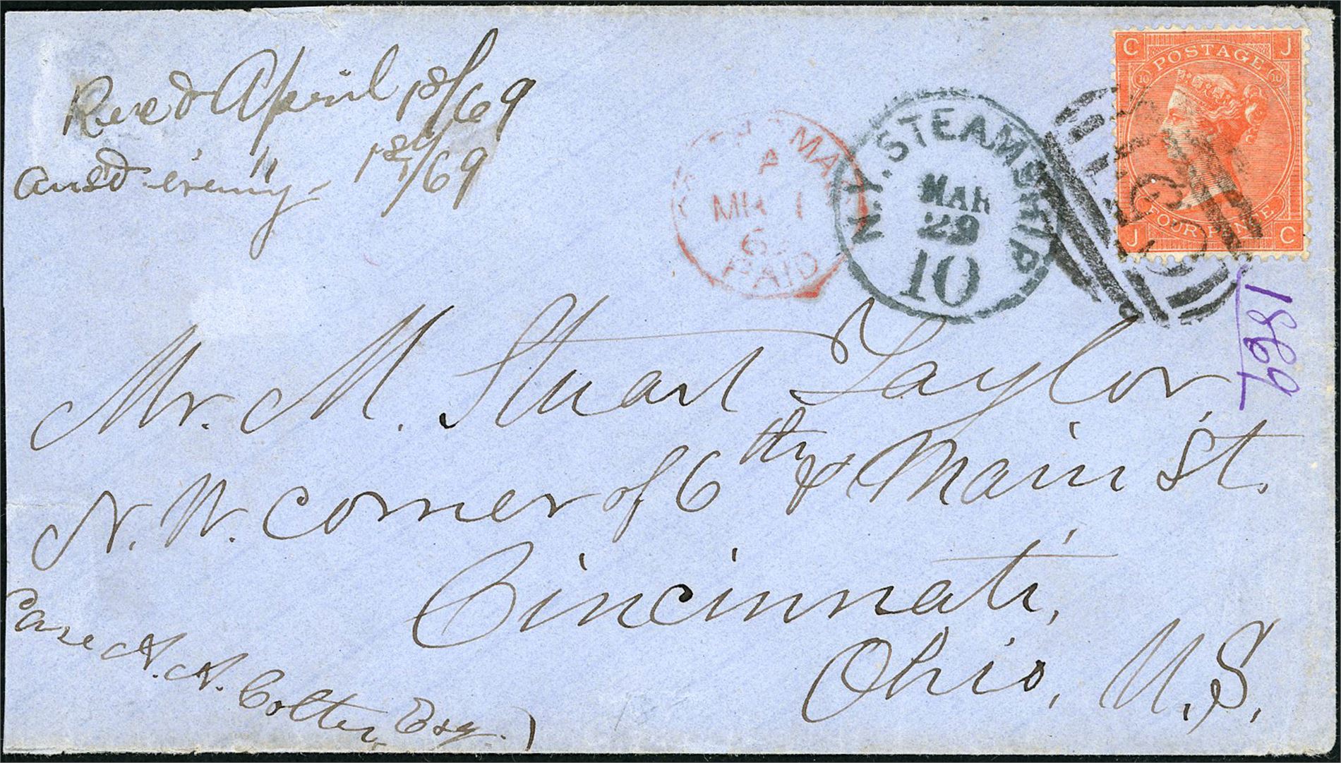 Z 10/95. DWI. 4d (pl 10) orange on envelope, cancelled "C 51" and "St Thomas Mr 1 69" at side together with "N.Y. Steamer Mar 29 10" postmark and sent to Ohio, U.S.A.