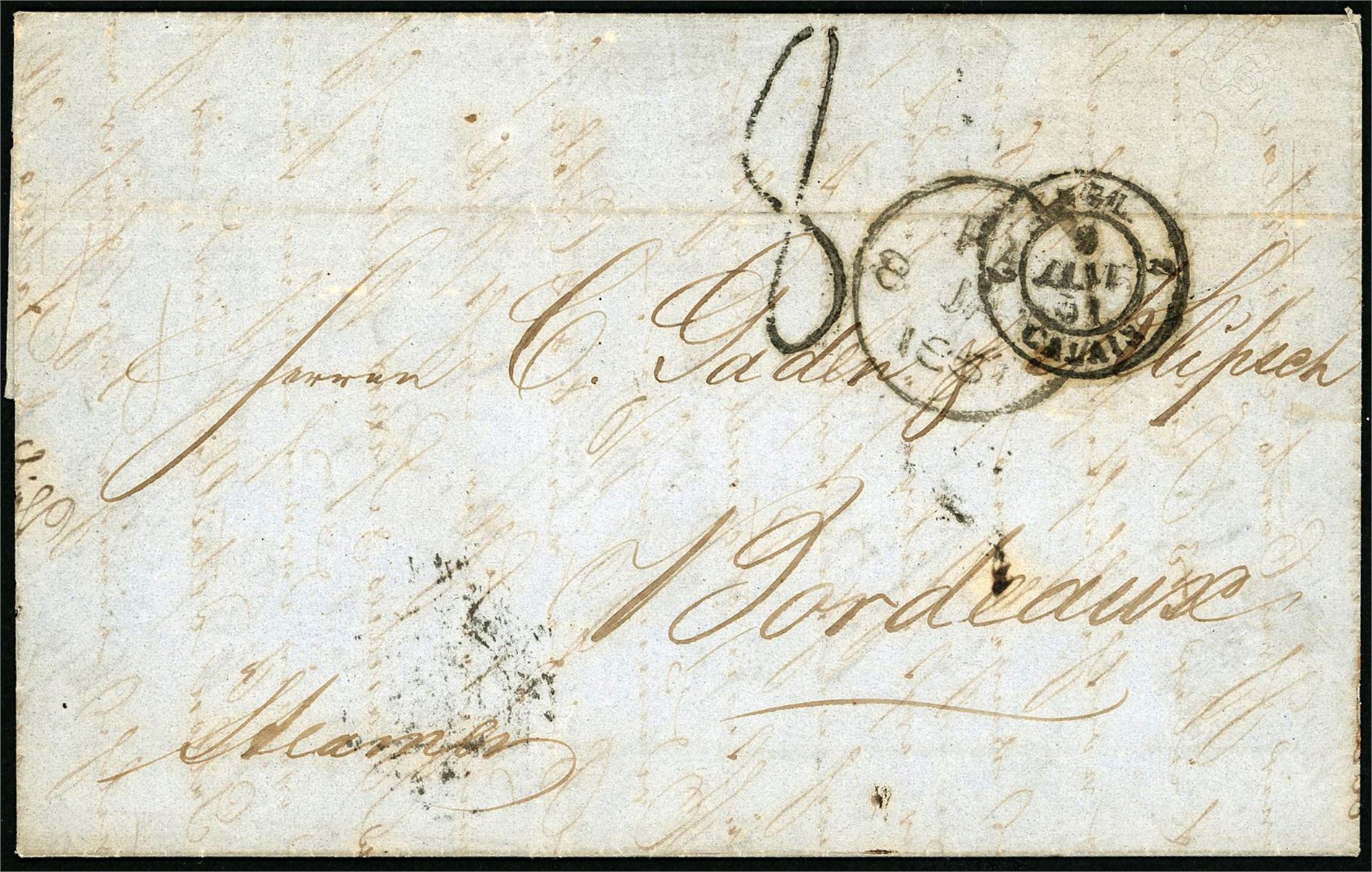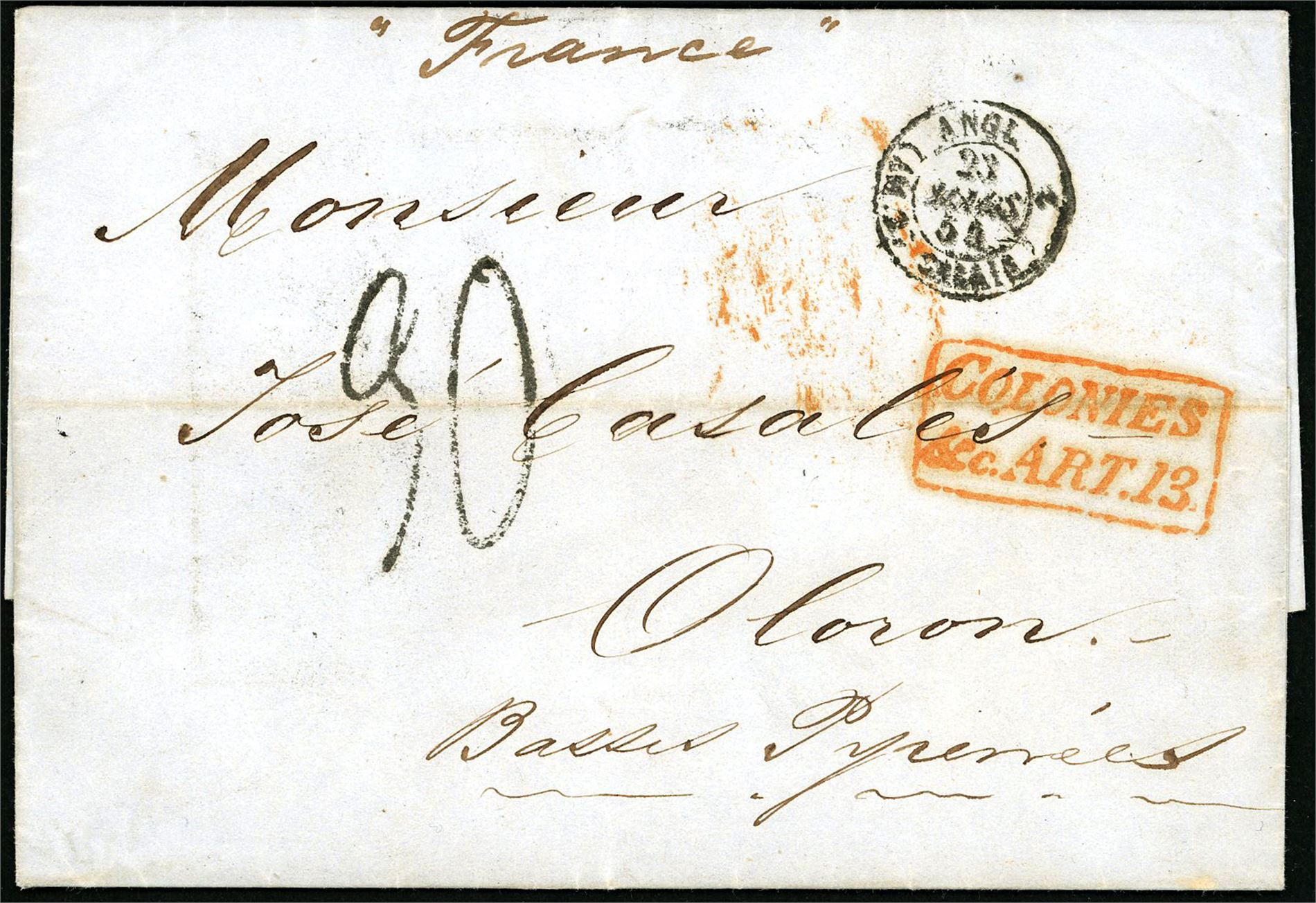 Two letters, sent from St Thomas to France. One to Oloron with red "Colonies &.c. Art. 13", "Angl. Calais" and French postagenumber "90" on front and one to Bordeaux with french postagenumber "8" on front.