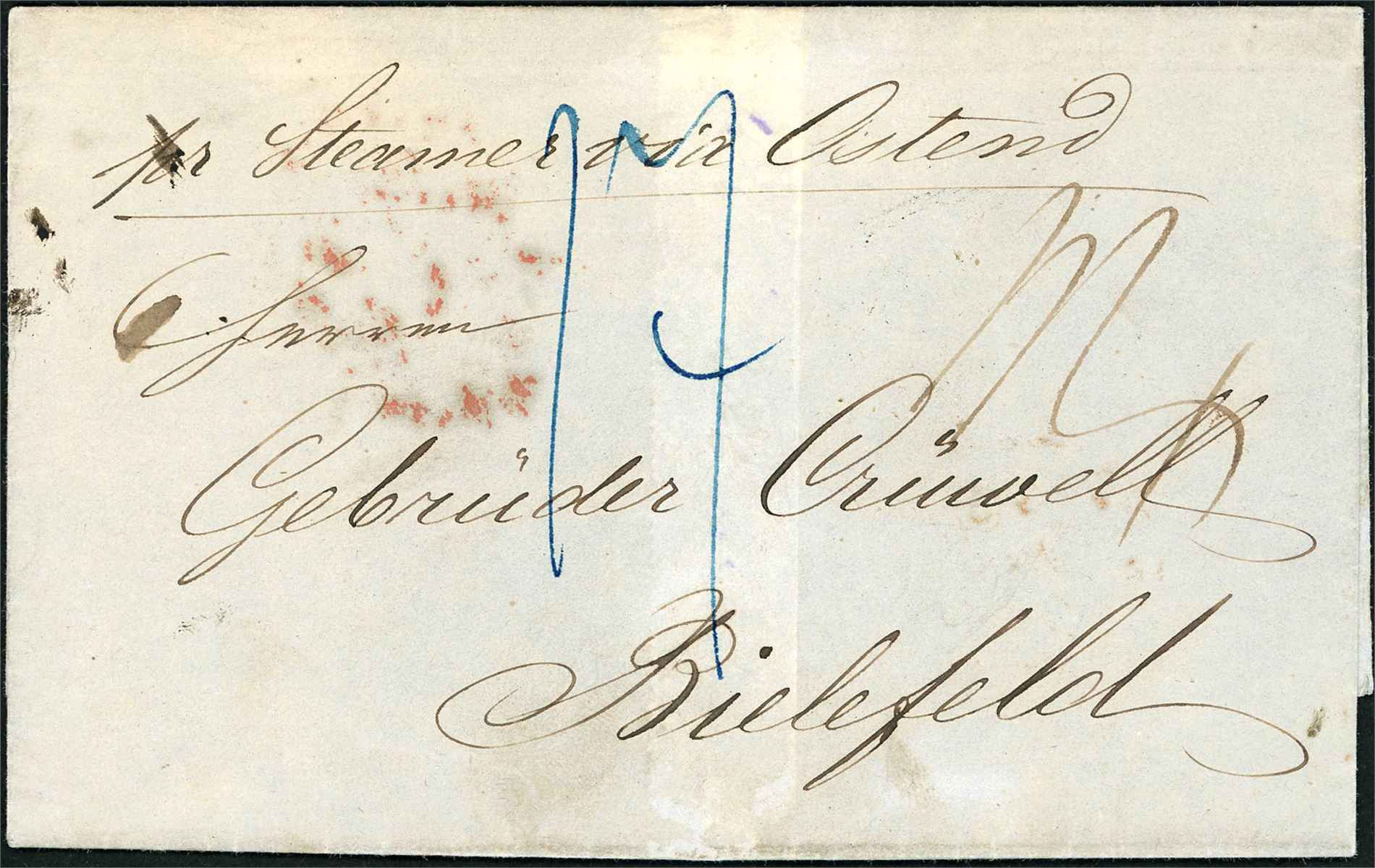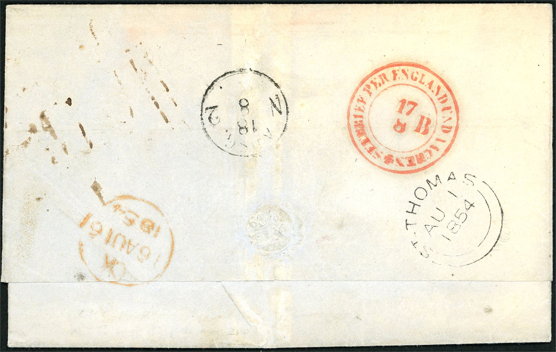 An entire, with "St. Thomas Au 1 1854" on reverse amd sent with British Packet, via London, Aachen to Bielefeld, Germany. A red postmark "Seebrief Per England und Aachen 17.8 B" also on reverse. Postage "17" (sh) to pay in Germany.