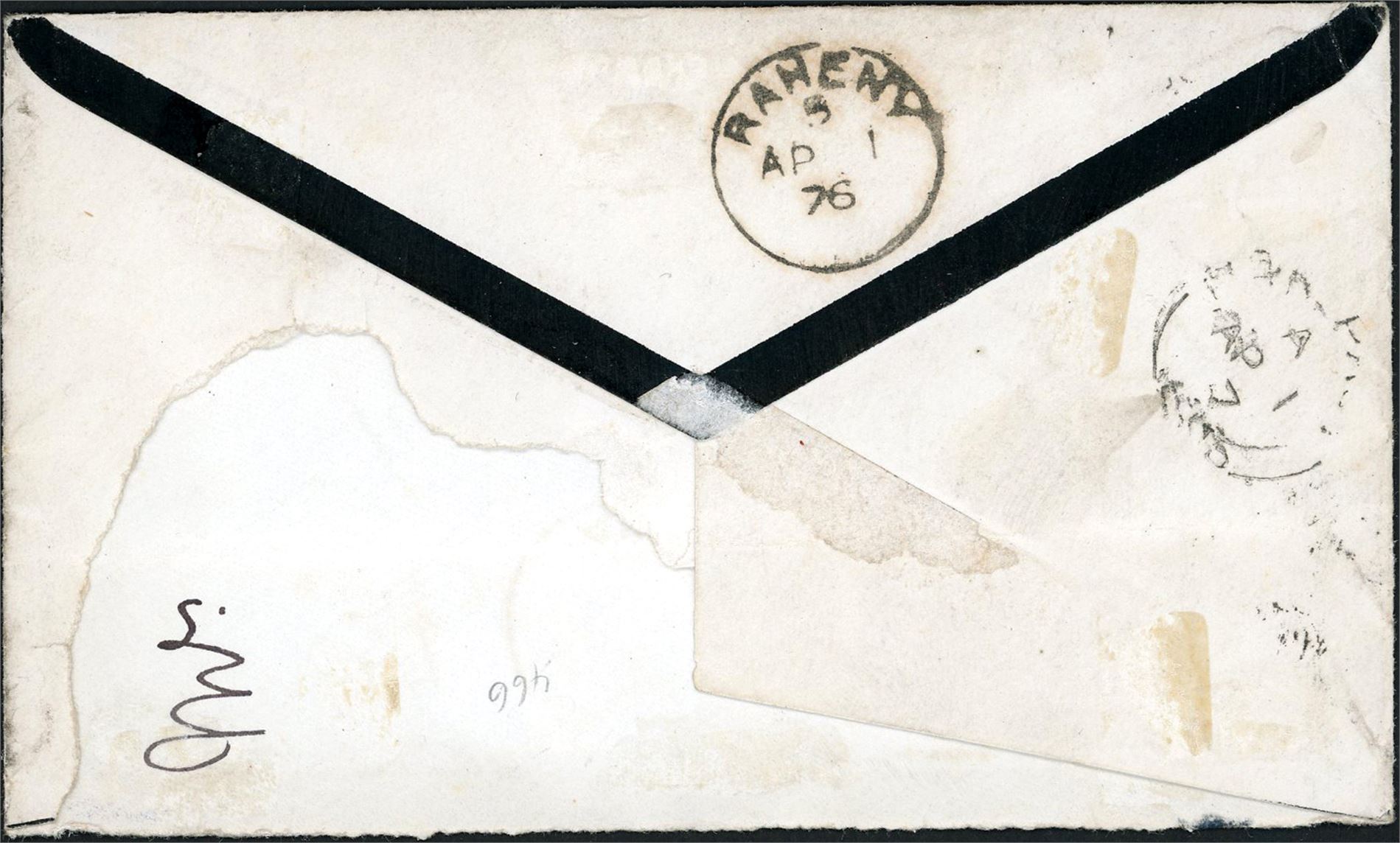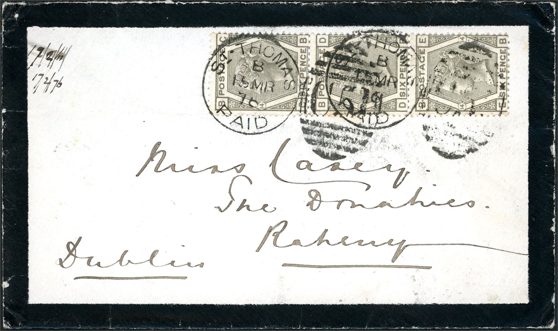 Z 21. DWI. 18d postage to Ireland. Three 6 d on envelope, cancelled duplex "St. Thomas Paid B 15 Mr 75", and sent to Ramsey. Arrival postmark at reverse. The envelope miss one flap.