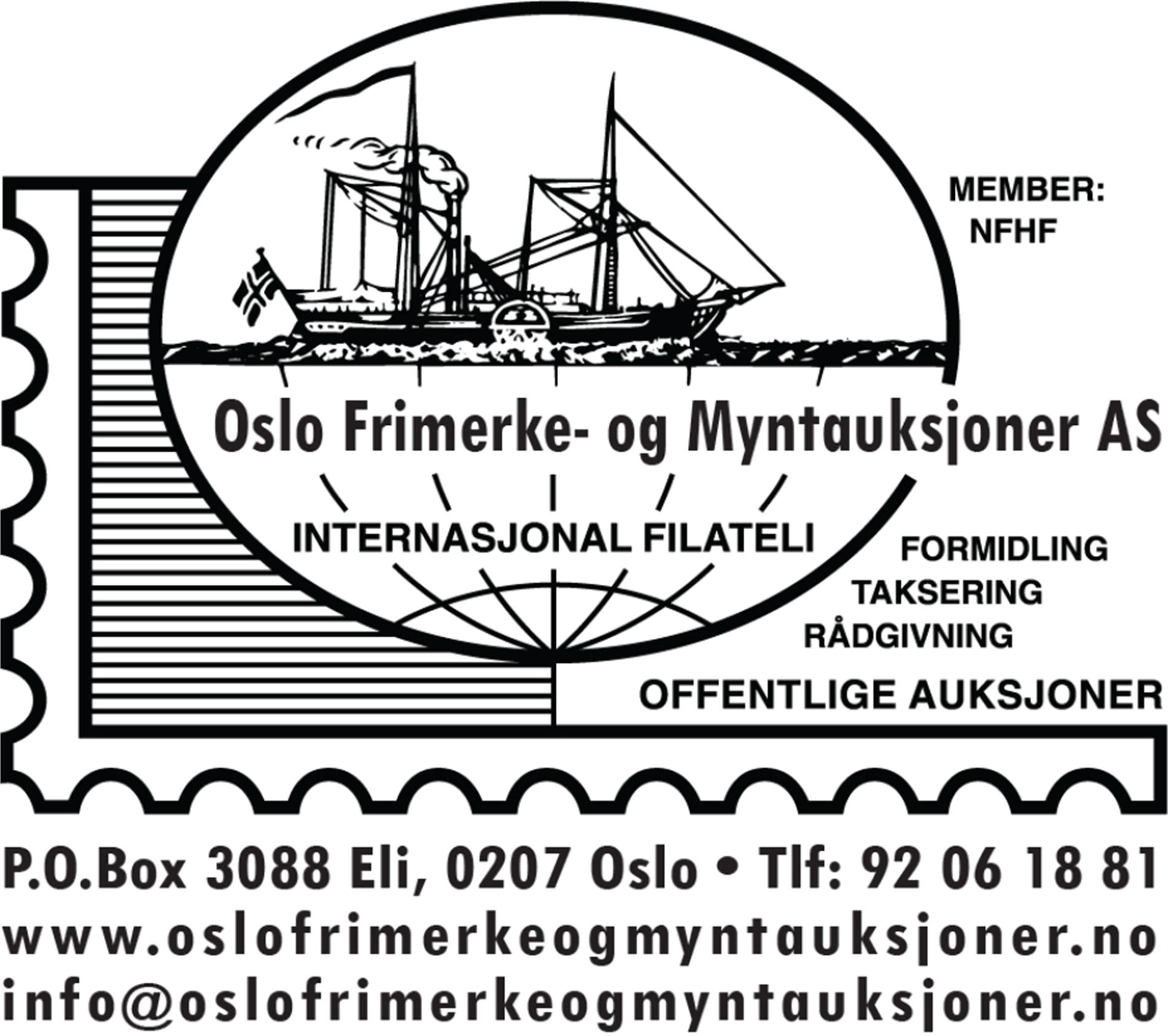 At the hammer price there will be a 20% commission plus any postage and Nkr 100 in bank-charge. If it is desired to submit objects for certification, this must be agreed within the first three days of the auction. Payment is made as an advance or upon collection of the objects.