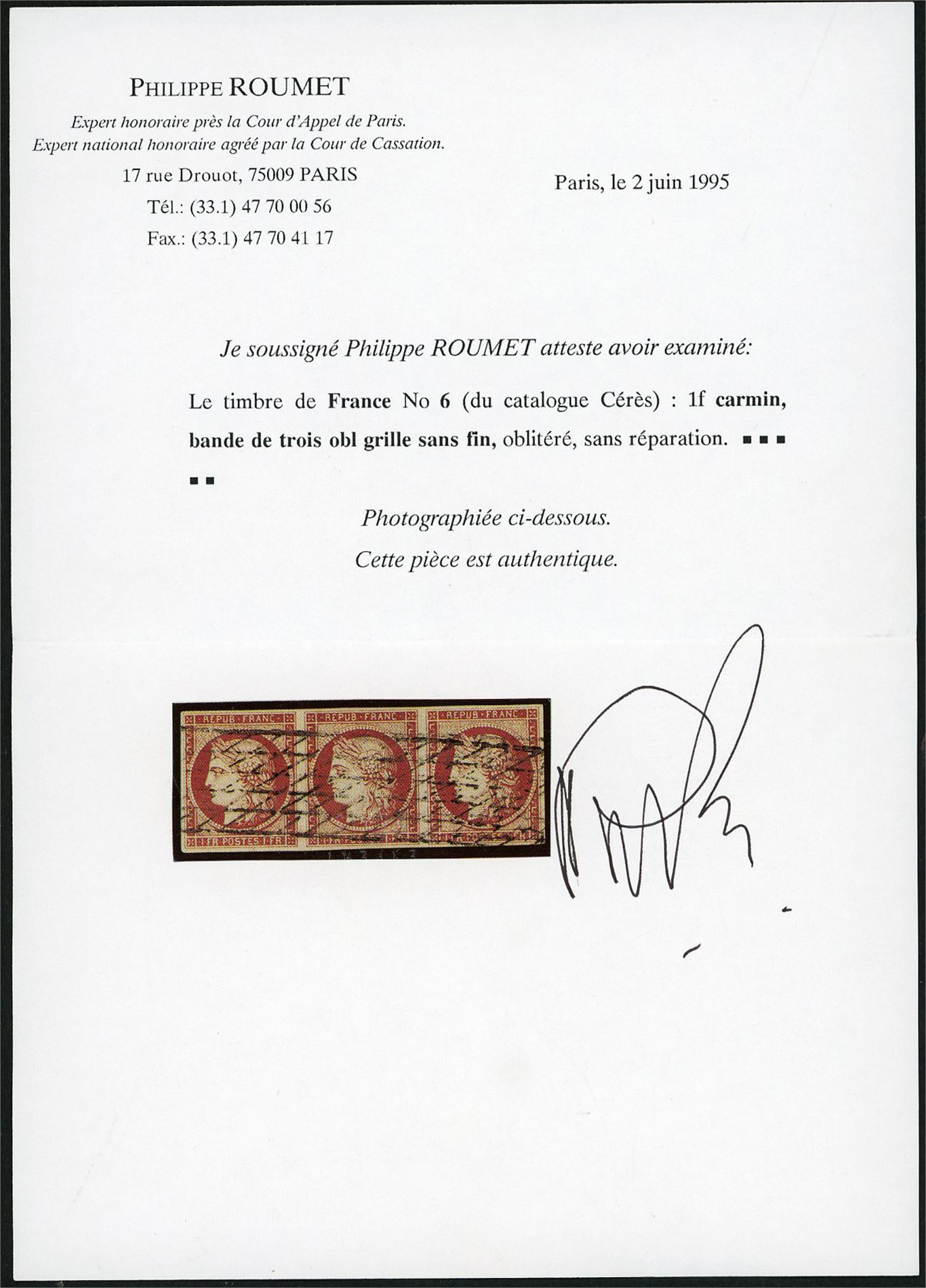 7. 1 Fr Ceres in a strip of three, cancelled with grid. Margins at all sides. Signed Calves and Roumet and cert. Roumet (1995).