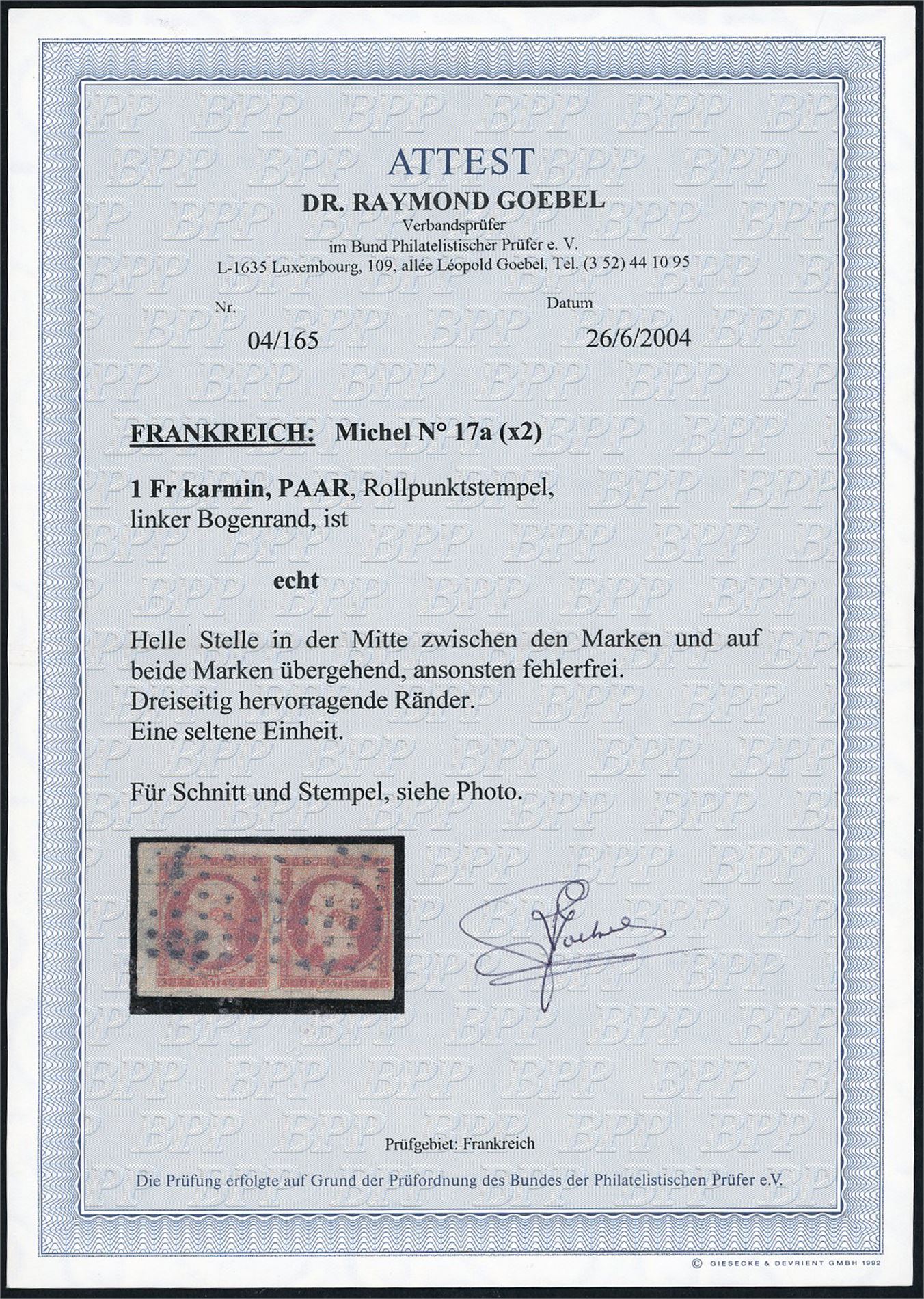 17. 1 Fr Napoleon in a fine horizontal pair. Three wide margins. Signed calves, Brun and Goebel BPP and Cert Goebel (2004).