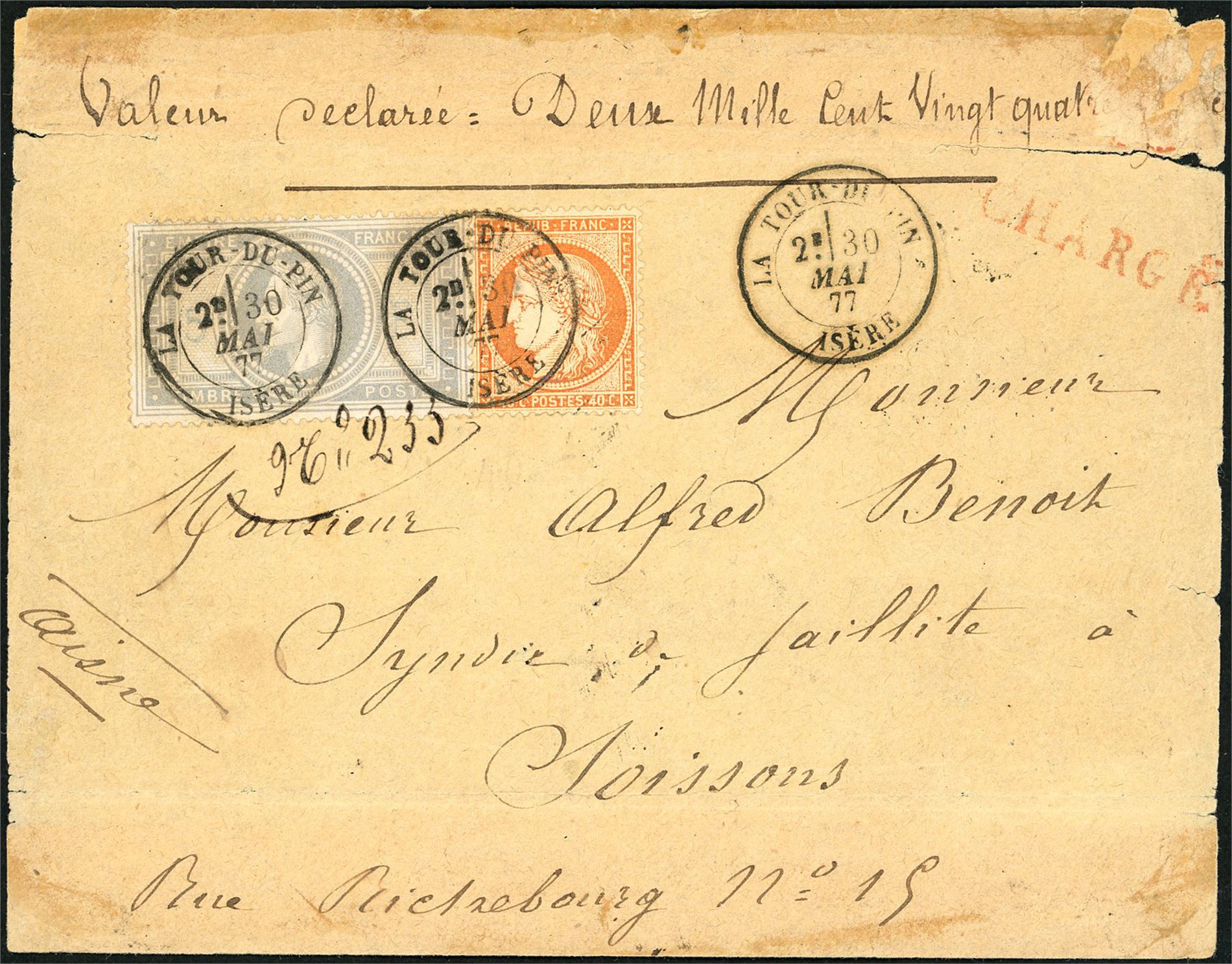 32,35. The 5 Fr together with a 40 c on coverfront (insured cover), cancelled "La Tour-Du-Pin 30 mai 77". The coverfront with some faults, but this not disturb the stamps.